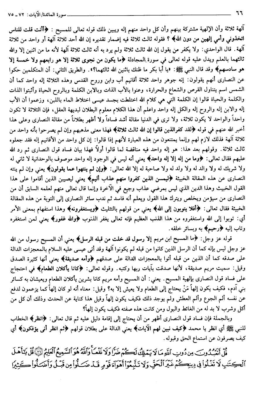 آلهة ثلاثة وأن الإلهية مشتركة بينهم وأن كل واحد منهم إله ويبين ذلك قوله تعالى للمسيح: أَأَنْتَ قُلْتَ لِلنَّاسِ اتَّخِذُونِي وَأُمِّي إِلهَيْنِ مِنْ دُونِ اللَّهِ؟ فقوله ثالث ثلاثة فيه إضمار تقديره إن الله أحد ثلاثة آلهة أو واحد من ثلاثة آلهة. قال الواحدي: ولا يكفر من يقول إن الله ثالث ثلاثة ولم يرد به أنه ثالث ثلاثة آلهة لأنه ما من اثنين إلا والله ثالثهما بالعلم ويدل عليه قوله تعالى في سورة المجادلة ما يَكُونُ مِنْ نَجْوى ثَلاثَةٍ إِلَّا هُوَ رابِعُهُمْ وَلا خَمْسَةٍ إِلَّا هُوَ سادِسُهُمْ وقد قال النبي صلى الله عليه وسلم: «يا أبا بكر ما ظنك باثنين الله ثالثهما؟». والطريق الثاني: أن المتكلمين حكوا عن النصارى أنهم يقولون: إنه جوهر واحد ثلاثة أقانيم أب وابن وروح القدس وهذه الثلاثة إله واحد كما أن الشمس اسم يتناول القرص والشعاع والحرارة، وعنوا بالأب الذات وبالابن الكلمة وبالروح الحياة وأثبتوا الذات والكلمة والحياة قالوا إن الكلمة التي هي كلام الله اختلطت بجسد عيسى اختلاط الماء باللبن، وزعموا أن الأب إله والابن إله والروح إله والكل إله واحد واعلم أن هذا الكلام معلوم البطلان لبديهة العقل، فإن الثلاثة لا تكون واحدا والواحد لا يكون ثلاثة، ولا ترى في الدنيا مقالة أشد فسادا ولا أظهر بطلانا من مقالة النصارى وعلى هذا أخبر الله عنهم في قوله لَقَدْ كَفَرَ الَّذِينَ قالُوا إِنَّ اللَّهَ ثالِثُ ثَلاثَةٍ فهذا معنى مذهبهم وإن لم يصرحوا بأنه واحد من ثلاثة آلهة فذلك لازم لهم وإنما يمتنعون من هذه العبارة لأنهم إذا قالوا: إن كل واحد من الأقانيم إله فقد جعلوه ثالث ثلاثة. وقولهم بعد هذا: هو إله واحد فيه مناقضة لما قالوا أولا فهذا بيان فساد قول النصارى ثم رد الله عليهم فقال تعالى: وَما مِنْ إِلهٍ إِلَّا إِلهٌ واحِدٌ يعني أنه ليس في الوجود إله واحد موصوف بالوحدانية لا ثاني له ولا شريك له ولا والد له ولا ولد له ولا صاحبة له إلا الله تعالى: وَإِنْ لَمْ يَنْتَهُوا عَمَّا يَقُولُونَ يعني وإن لم ينته النصارى عن هذه المقالة الخبيثة لَيَمَسَّنَّ الَّذِينَ كَفَرُوا مِنْهُمْ عَذابٌ أَلِيمٌ يعني ليصيبن الذين أقاموا على هذا القول الخبيث وهذا الدين الذي ليس بمرضي عذاب وجيع في الآخرة وإنما قال تعالى منهم لعلمه السابق أن من النصارى من سيؤمن ويخلص ويترك هذا القول ويعلم أنه فاسد ثم ندب سائر النصارى إلى التوبة من هذه المقالة الخبيثة فقال تعالى: أَفَلا يَتُوبُونَ إِلَى اللَّهِ يعني من قولهم بالتثليث وَيَسْتَغْفِرُونَهُ وهذا استفهام بمعنى الأمر أي: توبوا إلى الله واستغفروه من هذا الذنب العظيم فإنه تعالى يغفر الذنوب وَاللَّهُ غَفُورٌ يعني لمن استغفره وتاب إليه رَحِيمٌ به وبسائر خلقه.