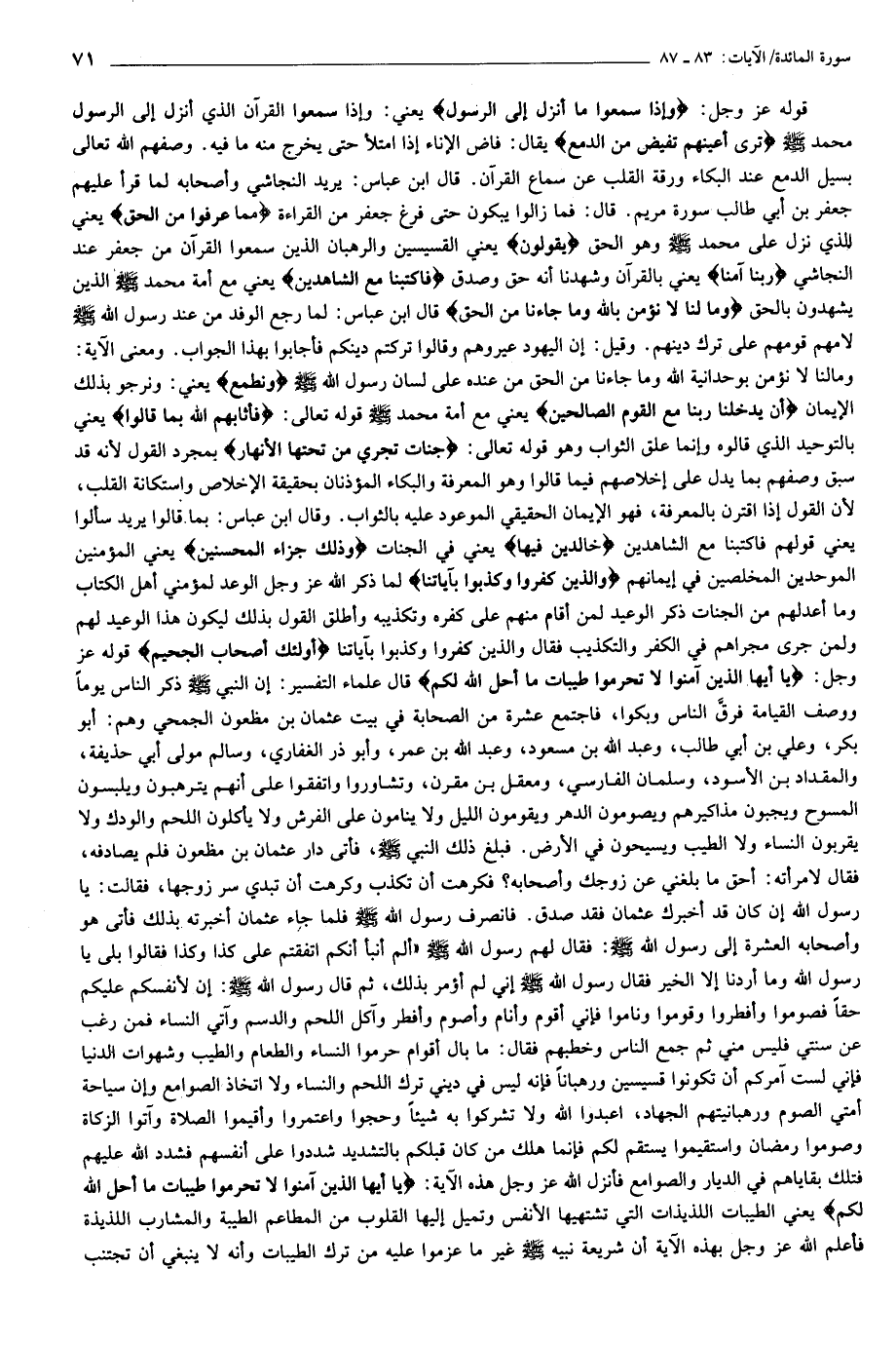 وَإِذا سَمِعُوا ما أُنْزِلَ إِلَى الرَّسُولِ تَرى أَعْيُنَهُمْ تَفِيضُ مِنَ الدَّمْعِ مِمَّا عَرَفُوا مِنَ الْحَقِّ يَقُولُونَ رَبَّنا آمَنَّا فَاكْتُبْنا مَعَ الشَّاهِدِينَ (83) وَما لَنا لا نُؤْمِنُ بِاللَّهِ وَما جاءَنا مِنَ الْحَقِّ وَنَطْمَعُ أَنْ يُدْخِلَنا رَبُّنا مَعَ الْقَوْمِ الصَّالِحِينَ (84) فَأَثابَهُمُ اللَّهُ بِما قالُوا جَنَّاتٍ تَجْرِي مِنْ تَحْتِهَا الْأَنْهارُ خالِدِينَ فِيها وَذلِكَ جَزاءُ الْمُحْسِنِينَ (85) وَالَّذِينَ كَفَرُوا وَكَذَّبُوا بِآياتِنا أُولئِكَ أَصْحابُ الْجَحِيمِ (86) يا أَيُّهَا الَّذِينَ آمَنُوا لا تُحَرِّمُوا طَيِّباتِ ما أَحَلَّ اللَّهُ لَكُمْ وَلا تَعْتَدُوا إِنَّ اللَّهَ لا يُحِبُّ الْمُعْتَدِينَ (87)