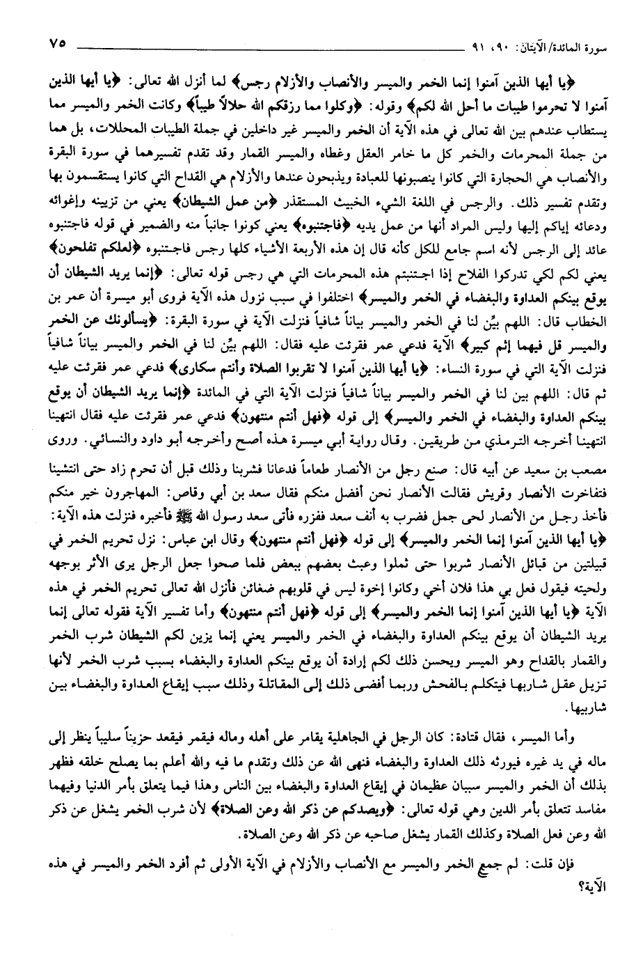 قوله عز وجل: يا أَيُّهَا الَّذِينَ آمَنُوا إِنَّمَا الْخَمْرُ وَالْمَيْسِرُ وَالْأَنْصابُ وَالْأَزْلامُ رِجْسٌ لما أنزل الله تعالى: يا أَيُّهَا الَّذِينَ آمَنُوا لا تُحَرِّمُوا طَيِّباتِ ما أَحَلَّ اللَّهُ لَكُمْ وقوله: وَكُلُوا مِمَّا رَزَقَكُمُ اللَّهُ حَلالًا طَيِّباً وكانت الخمر والميسر مما يستطاب عندهم بين الله تعالى في هذه الآية أن الخمر والميسر غير داخلين في جملة الطيبات المحللات، بل هما من جملة المحرمات والخمر كل ما خامر العقل وغطاه والميسر القمار وقد تقدم تفسيرهما في سورة البقرة والأنصاب هي الحجارة التي كانوا ينصبونها للعبادة ويذبحون عندها والأزلام هي القداح التي كانوا يستقسمون بها وتقدم تفسير ذلك. والرجس في اللغة الشيء الخبيث المستقذر مِنْ عَمَلِ الشَّيْطانِ يعني من تزيينه وإغوائه ودعائه إياكم إليها وليس المراد أنها من عمل يديه فَاجْتَنِبُوهُ يعني كونوا جانبا منه والضمير في قوله فاجتنبوه عائد إلى الرجس لأنه اسم جامع للكل كأنه قال إن هذه الأربعة الأشياء كلها رجس فاجتنبوه لَعَلَّكُمْ تُفْلِحُونَ يعني لكم لكي تدركوا الفلاح إذا اجتنبتم هذه المحرمات التي هي رجس قوله تعالى: إِنَّما يُرِيدُ الشَّيْطانُ أَنْ يُوقِعَ بَيْنَكُمُ الْعَداوَةَ وَالْبَغْضاءَ فِي الْخَمْرِ وَالْمَيْسِرِ اختلفوا في سبب نزول هذه الآية فروى أبو ميسرة أن عمر بن الخطاب قال: اللهم بيّن لنا في الخمر والميسر بيانا شافيا فنزلت الآية في سورة البقرة: يَسْئَلُونَكَ عَنِ الْخَمْرِ وَالْمَيْسِرِ قُلْ فِيهِما إِثْمٌ كَبِيرٌ الآية فدعي عمر فقرئت عليه فقال: اللهم بيّن لنا في الخمر والميسر بيانا شافيا فنزلت الآية التي في سورة النساء: يا أَيُّهَا الَّذِينَ آمَنُوا لا تَقْرَبُوا الصَّلاةَ وَأَنْتُمْ سُكارى فدعي عمر فقرئت عليه ثم قال: اللهم بين لنا في الخمر والميسر بيانا شافيا فنزلت الآية التي في المائدة إِنَّما يُرِيدُ الشَّيْطانُ أَنْ يُوقِعَ بَيْنَكُمُ الْعَداوَةَ وَالْبَغْضاءَ فِي الْخَمْرِ وَالْمَيْسِرِ إلى قوله فَهَلْ أَنْتُمْ مُنْتَهُونَ فدعي عمر فقرئت عليه فقال انتهينا انتهينا أخرجه الترمذي من طريقين. وقال رواية أبي ميسرة هذه أصح وأخرجه أبو داود والنسائي. وروى مصعب بن سعيد عن أبيه قال: صنع رجل من الأنصار طعاما فدعانا فشربنا وذلك قبل أن تحرم زاد حتى انتشينا فتفاخرت الأنصار وقريش فقالت الأنصار نحن أفضل منكم فقال سعد بن أبي وقاص: المهاجرون خير منكم فأخذ رجل من الأنصار لحى جمل فضرب به أنف سعد ففزره فأتى سعد رسول الله صلى الله عليه وسلم فأخبره فنزلت هذه الآية: