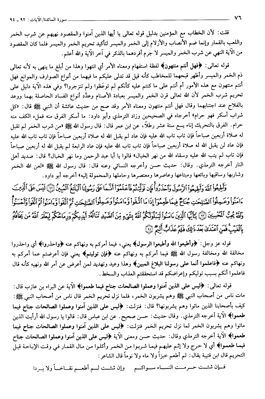 وَأَطِيعُوا اللَّهَ وَأَطِيعُوا الرَّسُولَ وَاحْذَرُوا فَإِنْ تَوَلَّيْتُمْ فَاعْلَمُوا أَنَّما عَلى رَسُولِنَا الْبَلاغُ الْمُبِينُ (92) لَيْسَ عَلَى الَّذِينَ آمَنُوا وَعَمِلُوا الصَّالِحاتِ جُناحٌ فِيما طَعِمُوا إِذا مَا اتَّقَوْا وَآمَنُوا وَعَمِلُوا الصَّالِحاتِ ثُمَّ اتَّقَوْا وَآمَنُوا ثُمَّ اتَّقَوْا وَأَحْسَنُوا وَاللَّهُ يُحِبُّ الْمُحْسِنِينَ (93) يا أَيُّهَا الَّذِينَ آمَنُوا لَيَبْلُوَنَّكُمُ اللَّهُ بِشَيْءٍ مِنَ الصَّيْدِ تَنالُهُ أَيْدِيكُمْ وَرِماحُكُمْ لِيَعْلَمَ اللَّهُ مَنْ يَخافُهُ بِالْغَيْبِ فَمَنِ اعْتَدى بَعْدَ ذلِكَ فَلَهُ عَذابٌ أَلِيمٌ (94)