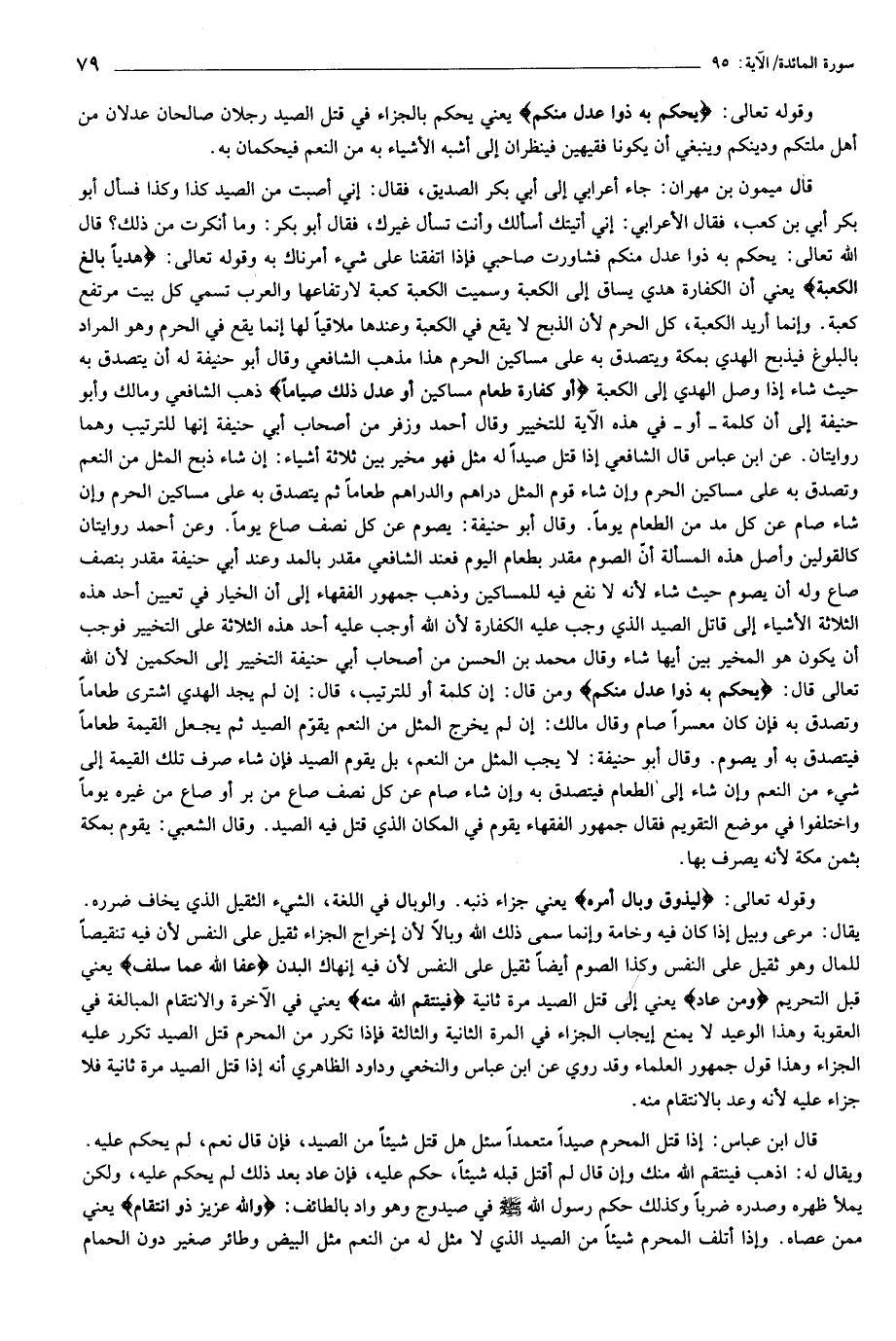 قال ميمون بن مهران: جاء أعرابي إلى أبي بكر الصديق، فقال: إني أصبت من الصيد كذا وكذا فسأل أبو بكر أبي بن كعب، فقال الأعرابي: إني أتيتك أسألك وأنت تسأل غيرك، فقال أبو بكر: وما أنكرت من ذلك؟ قال الله تعالى: يَحْكُمُ بِهِ ذَوا عَدْلٍ مِنْكُمْ فشاورت صاحبي فإذا اتفقنا على شيء أمرناك به وقوله تعالى: هَدْياً بالِغَ الْكَعْبَةِ يعني أن الكفارة هدي يساق إلى الكعبة وسميت الكعبة كعبة لارتفاعها والعرب تسمي كل بيت مرتفع كعبة. وإنما أريد الكعبة، كل الحرم لأن الذبح لا يقع في الكعبة وعندها ملاقيا لها إنما يقع في الحرم وهو المراد بالبلوغ فيذبح الهدي بمكة ويتصدق به على مساكين الحرم هذا مذهب الشافعي وقال أبو حنيفة له أن يتصدق به حيث شاء إذا وصل الهدي إلى الكعبة أَوْ كَفَّارَةٌ طَعامُ مَساكِينَ أَوْ عَدْلُ ذلِكَ صِياماً ذهب الشافعي ومالك وأبو حنيفة إلى أن كلمة- أو- في هذه الآية للتخيير وقال أحمد وزفر من أصحاب أبي حنيفة إنها للترتيب وهما روايتان. عن ابن عباس قال الشافعي إذا قتل صيدا له مثل فهو مخير بين ثلاثة أشياء: إن شاء ذبح المثل من النعم وتصدق به على مساكين الحرم وإن شاء قوم المثل دراهم والدراهم طعاما ثم يتصدق به على مساكين الحرم وإن شاء صام عن كل مد من الطعام يوما. وقال أبو حنيفة: يصوم عن كل نصف صاع يوما. وعن أحمد روايتان كالقولين وأصل هذه المسألة أنّ الصوم مقدر بطعام اليوم فعند الشافعي مقدر بالمد وعند أبي حنيفة مقدر بنصف صاع وله أن يصوم حيث شاء لأنه لا نفع فيه للمساكين وذهب جمهور الفقهاء إلى أن الخيار في تعيين أحد هذه الثلاثة الأشياء إلى قاتل الصيد الذي وجب عليه الكفارة لأن الله أوجب عليه أحد هذه الثلاثة على التخيير فوجب أن يكون هو المخير بين أيها شاء وقال محمد بن الحسن من أصحاب أبي حنيفة التخيير إلى الحكمين لأن الله تعالى قال: يَحْكُمُ بِهِ ذَوا عَدْلٍ مِنْكُمْ ومن قال: إن كلمة أو للترتيب، قال: إن لم يجد الهدي اشترى طعاما وتصدق به فإن كان معسرا صام وقال مالك: إن لم يخرج المثل من النعم يقوّم الصيد ثم يجعل القيمة طعاما فيتصدق به أو يصوم. وقال أبو حنيفة: لا يجب المثل من النعم، بل يقوم الصيد فإن شاء صرف تلك القيمة إلى شيء من النعم وإن شاء إلى الطعام فيتصدق به وإن شاء صام عن كل نصف صاع من بر أو صاع من غيره يوما واختلفوا في موضع التقويم فقال جمهور الفقهاء يقوم في المكان الذي قتل فيه الصيد. وقال الشعبي: يقوم بمكة بثمن مكة لأنه يصرف بها.
