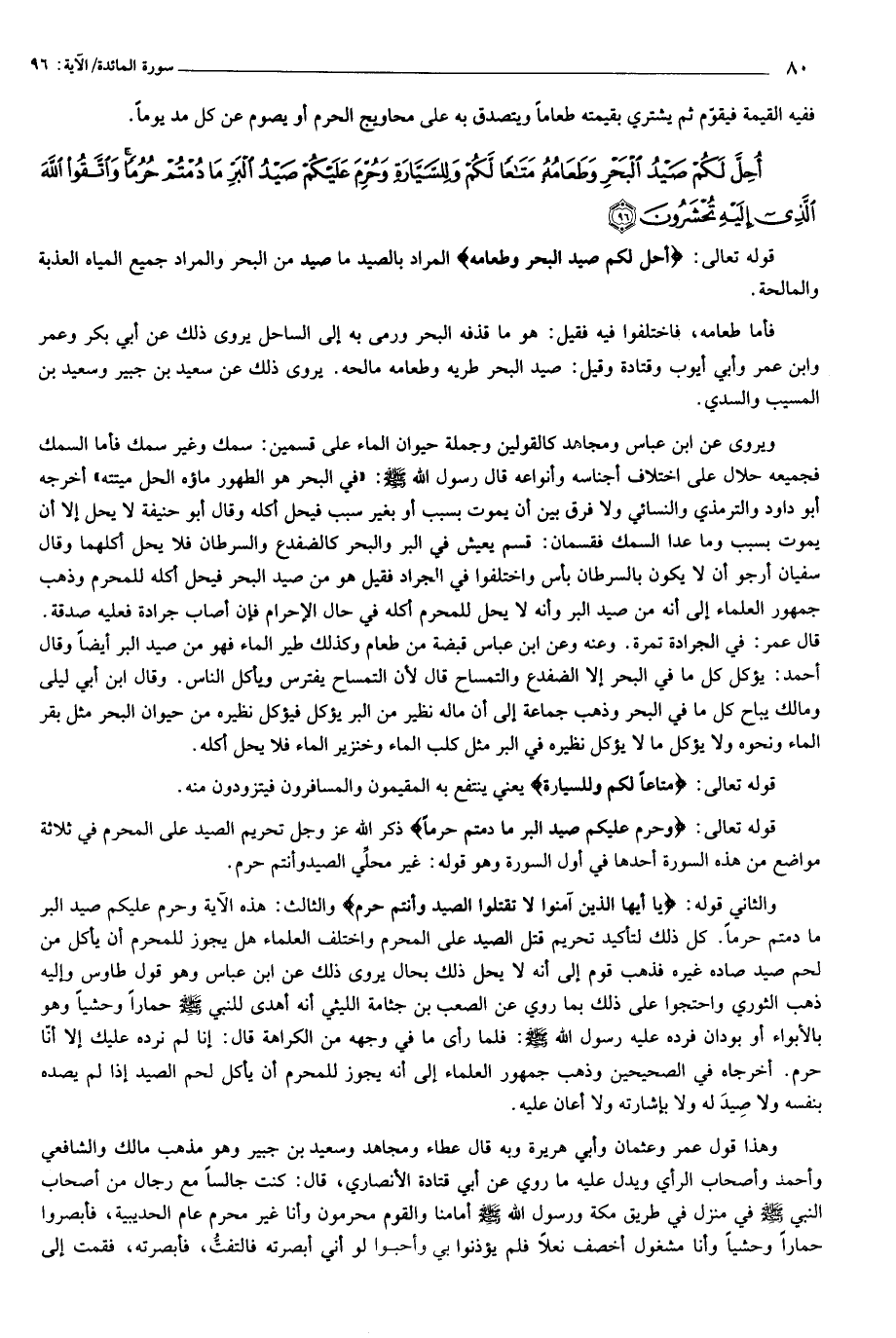 أُحِلَّ لَكُمْ صَيْدُ الْبَحْرِ وَطَعامُهُ مَتاعاً لَكُمْ وَلِلسَّيَّارَةِ وَحُرِّمَ عَلَيْكُمْ صَيْدُ الْبَرِّ ما دُمْتُمْ حُرُماً وَاتَّقُوا اللَّهَ الَّذِي إِلَيْهِ تُحْشَرُونَ (96)