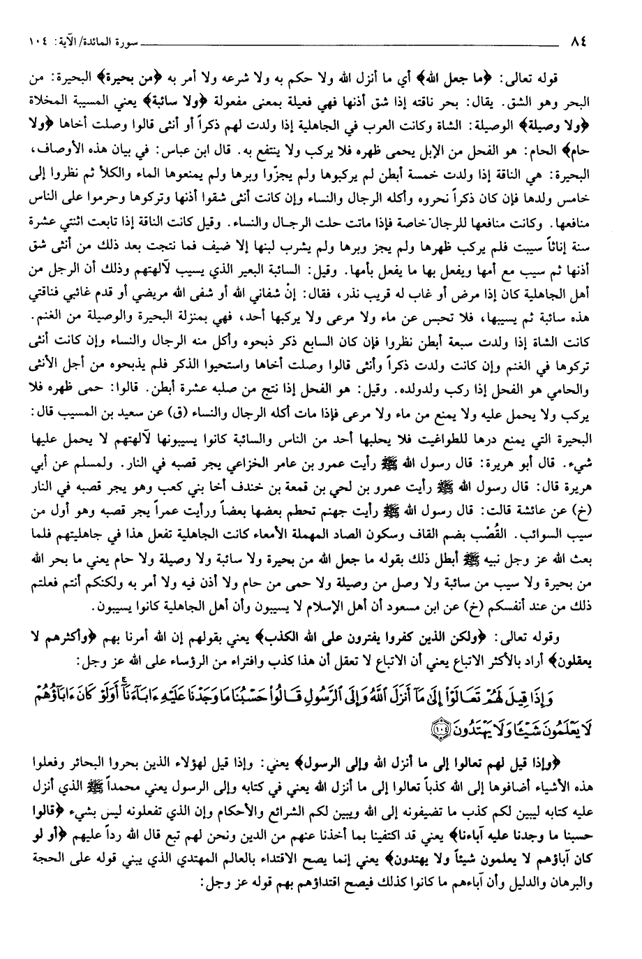 قوله تعالى: ما جَعَلَ اللَّهُ أي ما أنزل الله ولا حكم به ولا شرعه ولا أمر به مِنْ بَحِيرَةٍ البحيرة: من البحر وهو الشق. يقال: بحر ناقته إذا شق أذنها فهي فعلية بمعنى مفعولة وَلا سائِبَةٍ يعني المسيبة المخلاة وَلا وَصِيلَةٍ الوصيلة: الشاة وكانت العرب في الجاهلية إذا ولدت لهم ذكرا أو أنثى قالوا وصلت أخاها وَلا حامٍ الحام: هو الفحل من الإبل يحمى ظهره فلا يركب ولا ينتفع به. قال ابن عباس: في بيان هذه الأوصاف، البحيرة: هي الناقة إذا ولدت خمسة أبطن لم يركبوها ولم يجزّوا وبرها ولم يمنعوها الماء والكلأ ثم نظروا إلى خامس ولدها فإن كان ذكرا نحروه وأكله الرجال والنساء وإن كانت أنثى شقوا أذنها وتركوها وحرموا على الناس منافعها. وكانت منافعها للرجال خاصة فإذا ماتت حلت الرجال والنساء. وقيل كانت الناقة إذا تابعت اثنتي عشرة سنة إناثا سيبت فلم يركب ظهرها ولم يجز وبرها ولم يشرب لبنها إلا ضيف فما نتجت بعد ذلك من أنثى شق أذنها ثم سيب مع أمها ويفعل بها ما يفعل بأمها. وقيل: السائبة البعير الذي يسيب لآلهتهم وذلك أن الرجل من أهل الجاهلية كان إذا مرض أو غاب له قريب نذر، فقال: 7 ن شفاني الله أو شفى الله مريضي أو قدم غائبي فناقتي هذه سائبة ثم يسيبها، فلا تحبس عن ماء ولا مرعى ولا يركبها أحد، فهي بمنزلة البحيرة والوصيلة من الغنم.