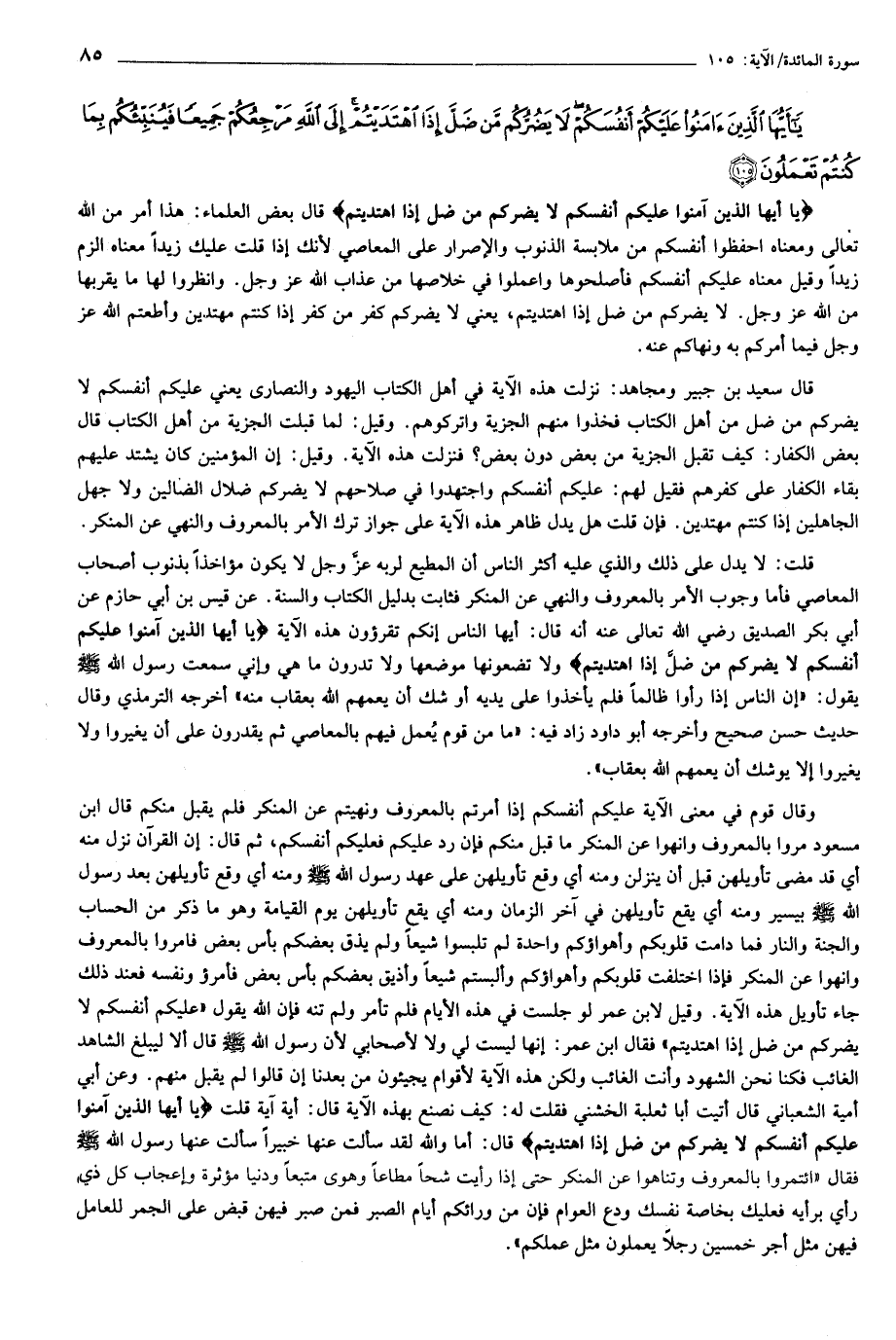 يا أَيُّهَا الَّذِينَ آمَنُوا عَلَيْكُمْ أَنْفُسَكُمْ لا يَضُرُّكُمْ مَنْ ضَلَّ إِذَا اهْتَدَيْتُمْ قال بعض العلماء: هذا أمر من الله تعالى ومعناه احفظوا أنفسكم من ملابسة الذنوب والإصرار على المعاصي لأنك إذا قلت عليك زيدا معناه الزم زيدا وقيل معناه عليكم أنفسكم فأصلحوها واعملوا في خلاصها من عذاب الله عز وجل. وانظروا لها ما يقربها من الله عز وجل. لا يضركم من ضل إذا اهتديتم، يعني لا يضركم كفر من كفر إذا كنتم مهتدين وأطعتم الله عز وجل فيما أمركم به ونهاكم عنه.