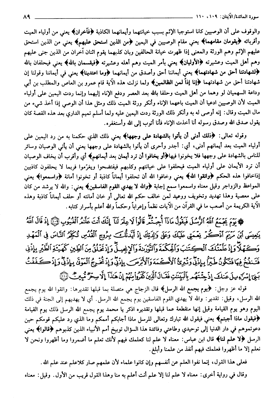 يَوْمَ يَجْمَعُ اللَّهُ الرُّسُلَ فَيَقُولُ ماذا أُجِبْتُمْ قالُوا لا عِلْمَ لَنا إِنَّكَ أَنْتَ عَلاَّمُ الْغُيُوبِ (109) إِذْ قالَ اللَّهُ يا عِيسَى ابْنَ مَرْيَمَ اذْكُرْ نِعْمَتِي عَلَيْكَ وَعَلى والِدَتِكَ إِذْ أَيَّدْتُكَ بِرُوحِ الْقُدُسِ تُكَلِّمُ النَّاسَ فِي الْمَهْدِ وَكَهْلاً وَإِذْ عَلَّمْتُكَ الْكِتابَ وَالْحِكْمَةَ وَالتَّوْراةَ وَالْإِنْجِيلَ وَإِذْ تَخْلُقُ مِنَ الطِّينِ كَهَيْئَةِ الطَّيْرِ بِإِذْنِي فَتَنْفُخُ فِيها فَتَكُونُ طَيْراً بِإِذْنِي وَتُبْرِئُ الْأَكْمَهَ وَالْأَبْرَصَ بِإِذْنِي وَإِذْ تُخْرِجُ الْمَوْتى بِإِذْنِي وَإِذْ كَفَفْتُ بَنِي إِسْرائِيلَ عَنْكَ إِذْ جِئْتَهُمْ بِالْبَيِّناتِ فَقالَ الَّذِينَ كَفَرُوا مِنْهُمْ إِنْ هذا إِلاَّ سِحْرٌ مُبِينٌ (110)