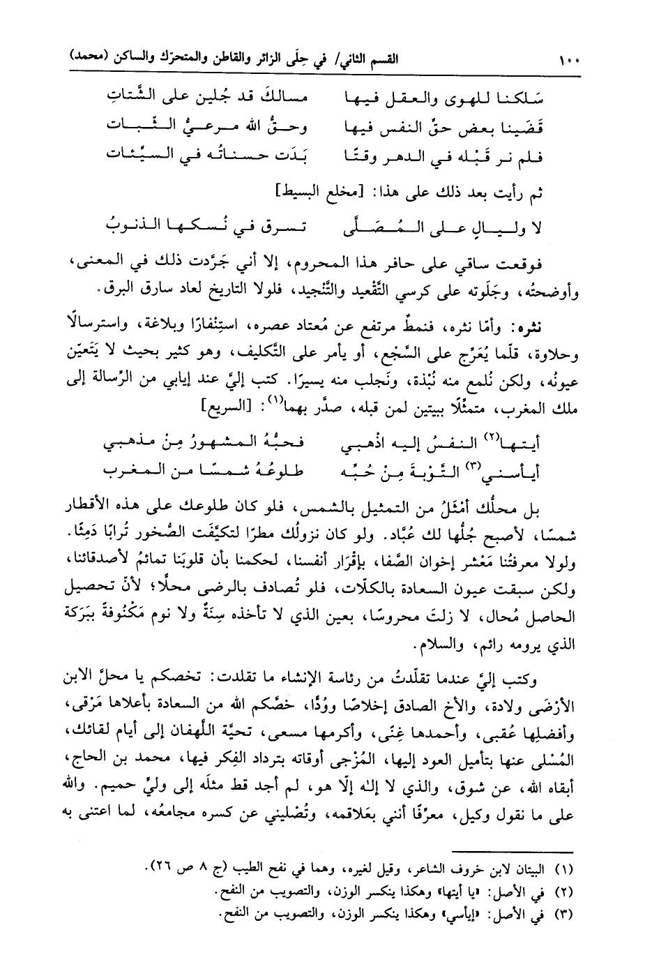 ولولا معرفتنا معشر إخوان الصّفا، بإقرار أنفسنا، لحكمنا بأن قلوبنا تمائم لأصدقائنا، ولكن سبقت عيون السعادة بالكلّات، فلو تصادف بالرضى محلّا؛ لأنّ تحصيل الحاصل محال، لا زلت محروسا، بعين الذي لا تأخذه سنة ولا نوم مكنوفة ببركة الذي يرومه رائم، والسلام.