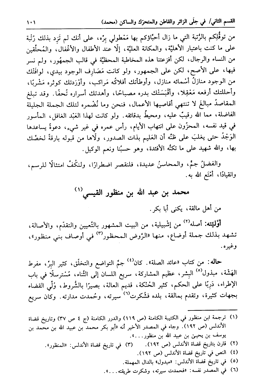 من توقّلكم بالرّتبة التي ما زال أحبّاؤكم بها ممطولي برّه، على أنك لم تزد بذلك رتبة على ما كنت باعتبار الأهليّة، والمكانة العليّة، إلّا عند الأطفال والأغفال، والمحلّقين من النساء والرجال، لكن أفزعتنا هذه المخاطبة المحظيّة في قالب الجمهور، ولم نسر فيها، على الأصح، لكن على الجمهور، ولو كانت مصارف الوجود بيدي، لوافتك من الوجود منازل أسمائه منازل، وأوطأتك أفلاكه مراكب، وأوردتك كوثره مشربا، وأحللتك أرفعه معقلا، وأقبستك بدره مصباحا، وأهدتك أسراره تحفا. وقد تبلغ المقاصد مبالغ لا تنتهي أقاصيها الأعمال، فنحن وما نضمره لتلك الجملة الجليلة الفاضلة، مما الله رقيب عليه، ومحيط بدقائقه. ولو كانت لهذا العبد الغافل، المأسور في قيد نفسه، المحزون على انتهاب الأيام، رأس عمره في غير شيء، دعوة يساعدها الوجد حتى يغلب على ظنّه أن العليم بذات الصدور، ولّاها من قبوله بارقة لخصّك بها، والله شهيد على ما تكنّه الأفئدة، وهو حسبنا ونعم الوكيل.
