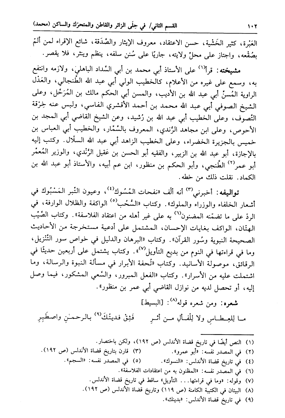 تواليفه: أخبرني «3» أنه ألّف «نفحات المسوك «4» ، وعيون التّبر المسبوك في أشعار الخلفاء والوزراء والملوك» . وكتاب «السّحب «5» الواكفة والظلال الوارفة، في الردّ على ما تضمّنه المضنون «6» به على غير أهله من اعتقاد الفلاسفة» . وكتاب الصّيّب الهتّان، الواكف بغايات الإحسان، والمشتمل على أدعية مستخرجة من الأحاديث الصحيحة النبوية وسور القرآن» . وكتاب «البرهان والدليل في خواص سور التّنزيل، وما في قراءتها في النوم من بديع التأويل «7» » . وكتاب يشتمل على أربعين حديثا في الرقائق، موصولة الأسانيد. وكتاب «تحفة الأبرار في مسألة النبوة والرسالة، وما اشتملت عليه من الأسرار» . وكتاب «الفعل المبرور، والسّعي المشكور، فيما وصل إليه، أو تحصل لديه من نوازل القاضي أبي عمر بن منظور» .