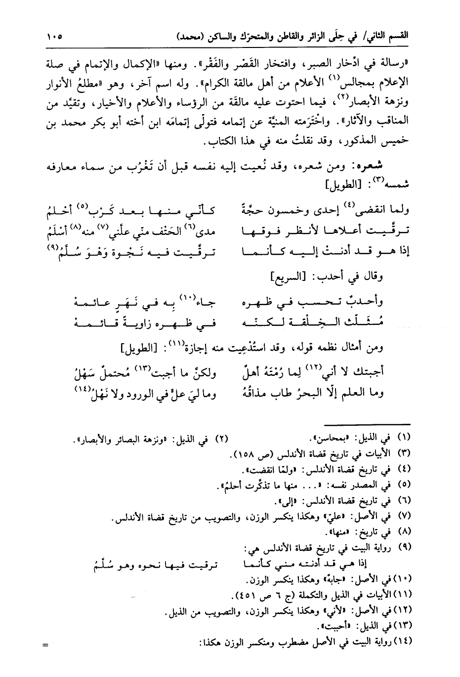 «رسالة في ادّخار الصبر، وافتخار القصر والفقر» . ومنها «الإكمال والإتمام في صلة الإعلام بمجالس «1» الأعلام من أهل مالقة الكرام» . وله اسم آخر، وهو «مطلع الأنوار ونزهة الأبصار «2» ، فيما احتوت عليه مالقة من الرؤساء والأعلام والأخيار، وتقيّد من المناقب والآثار» . واخترمته المنيّة عن إتمامه فتولّى إتمامه ابن أخته أبو بكر محمد بن خميس المذكور، وقد نقلت منه في هذا الكتاب.