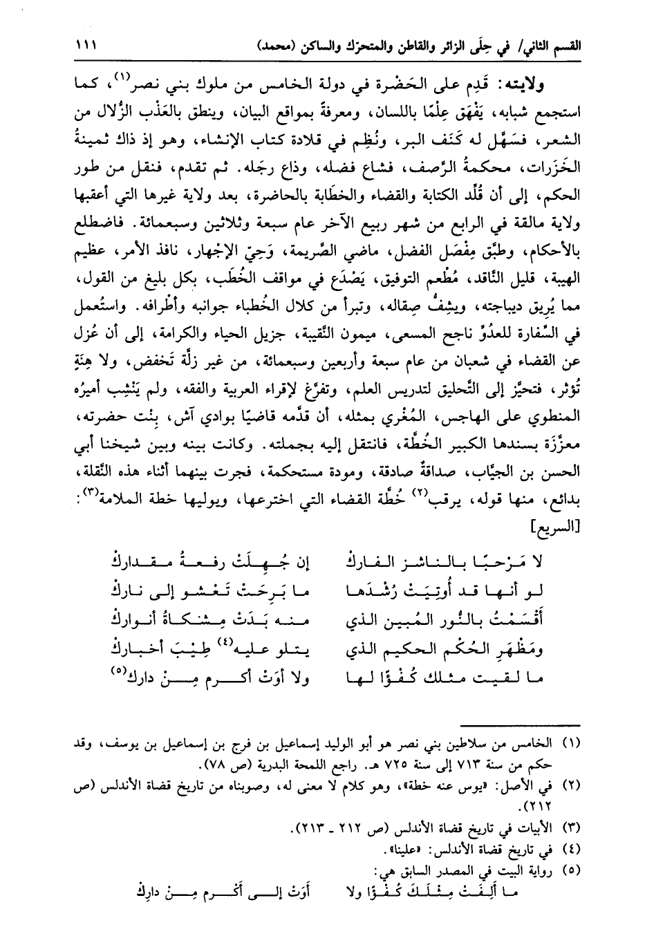 ولايته: قدم على الحضرة في دولة الخامس من ملوك بني نصر «1» ، كما استجمع شبابه، يفهق علما باللسان، ومعرفة بمواقع البيان، وينطق بالعذب الزّلال من الشعر، فسهّل له كنف البر، ونظم في قلادة كتاب الإنشاء، وهو إذ ذاك ثمينة الخزرات، محكمة الرّصف، فشاع فضله، وذاع رجله. ثم تقدم، فنقل من طور الحكم، إلى أن قلّد الكتابة والقضاء والخطابة بالحاضرة، بعد ولاية غيرها التي أعقبها ولاية مالقة في الرابع من شهر ربيع الآخر عام سبعة وثلاثين وسبعمائة. فاضطلع بالأحكام، وطبّق مفصل الفضل، ماضي الصّريمة، وحيّ الإجهار، نافذ الأمر، عظيم الهيبة، قليل النّاقد، مطعم التوفيق، يصدع في مواقف الخطب، بكل بليغ من القول، مما يريق ديباجته، ويشفّ صقاله، وتبرأ من كلال الخطباء جوانبه وأطرافه. واستعمل في السّفارة للعدوّ ناجح المسعى، ميمون النّقيبة، جزيل الحياء والكرامة، إلى أن عزل عن القضاء في شعبان من عام سبعة وأربعين وسبعمائة، من غير زلّة تخفض، ولا هنة تؤثر، فتحيّز إلى التّحليق لتدريس العلم، وتفرّغ لإقراء العربية والفقه، ولم ينشب أميره المنطوي على الهاجس، المغري بمثله، أن قدّمه قاضيا بوادي آش، بنت حضرته، معزّزة بسندها الكبير الخطّة، فانتقل إليه بجملته. وكانت بينه وبين شيخنا أبي الحسن بن الجيّاب، صداقة صادقة، ومودة مستحكمة، فجرت بينهما أثناء هذه النّقلة، بدائع، منها قوله، يرقب «2» خطّة القضاء التي اخترعها، ويوليها خطة الملامة «3» :
