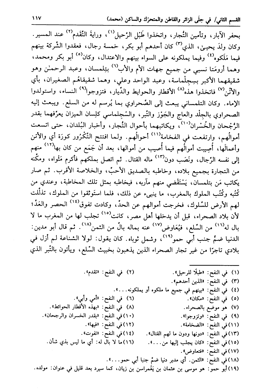 وكان ولد يحيى، الذي «3» كان أحدهم أبو بكر، خمسة رجال، فعقدوا الشّركة بينهم فيما ملكوه «4» وفيما يملكونه على السواء بينهم والاعتدال، وكان «5» أبو بكر ومحمد، وهما أرومتا نسبي من جميع جهات الأم والأب «6» بتلمسان، وعبد الرحمن وهو شقيقهما الأكبر بسجلماسة، وعبد الواحد وعلي، وهما شقيقاهم الصغيران، بأي والأتن «7» فاتخذوا هذه «8» الأقطار والحوايط والدّيار، فتزوجوا «9» النساء، واستولدوا الإماء. وكان التلمساني يبعث إلى الصّحراوي بما يرسم له من السلع. ويبعث إليه الصحراوي بالجلد والعاج والجوز والتّبر، والسّجلماسي كلسان الميزان يعرّفهما بقدر الرّجحان والخسران «10» ، ويكاتبهما بأحوال التّجار، وأخبار البلدان، حتى اتسعت أموالهم، وارتفعت في الفخامة «11» أحوالهم. ولما افتتح التّكرور كورة أي والأتن وأعمالها، أصيبت أموالهم فيما أصيب من أموالها، بعد أن جمع من كان بها «12» منهم إلى نفسه الرّجال، ونصب دون «13» ماله القتال. ثم اتصل بملكهم فأكرم مثواه، ومكّنه من التجارة بجميع بلاده، وخاطبه بالصديق الأحبّ، والخلاصة الأقرب. ثم صار يكاتب من بتلمسان، يستقضي منهم مآربه، فيخاطبه بمثل تلك المخاطبة، وعندي من كتبه وكتب الملوك بالمغرب، ما ينبئ عن ذلك، فلما استوثقوا من الملوك، تذلّلت لهم الأرض للسّلوك، فخرجت أموالهم عن الحدّ، وكادت تفوق «14» الحصر والعدّ؛ لأن بلاد الصحراء، قبل أن يدخلها أهل مصر، كانت «15» تجلب لها من المغرب ما لا بال له «16» من السّلع، فيعاوض «17» عنه بماله بال من الثمن «18» . ثم قال أبو مدين: