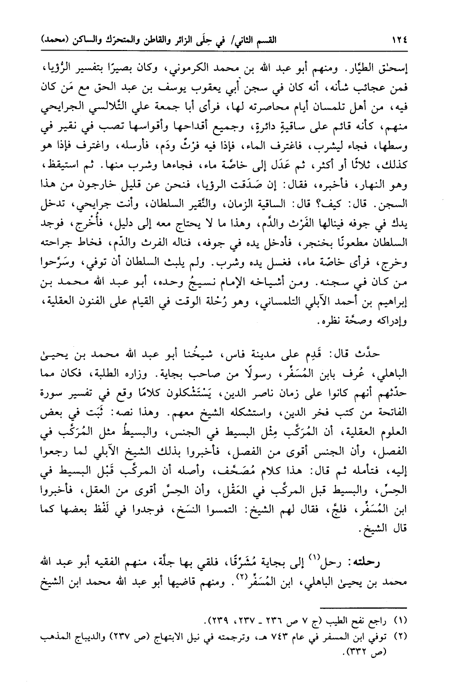 إسحاق الطيّار. ومنهم أبو عبد الله بن محمد الكرموني، وكان بصيرا بتفسير الرّؤيا، فمن عجائب شأنه، أنه كان في سجن أبي يعقوب يوسف بن عبد الحق مع من كان فيه، من أهل تلمسان أيام محاصرته لها، فرأى أبا جمعة علي التّلالسي الجرايحي منهم، كأنه قائم على ساقية دائرة، وجميع أقداحها وأقواسها تصب في نقير في وسطها، فجاء ليشرب، فاغترف الماء، فإذا فيه فرث ودم، فأرسله، واغترف فإذا هو كذلك، ثلاثا أو أكثر، ثم عدل إلى خاصّة ماء، فجاءها وشرب منها. ثم استيقظ، وهو النهار، فأخبره، فقال: إن صدقت الرؤيا، فنحن عن قليل خارجون من هذا السجن. قال: كيف؟ قال: الساقية الزمان، والنّقير السلطان، وأنت جرايحي، تدخل يدك في جوفه فينالها الفرث والدّم، وهذا ما لا يحتاج معه إلى دليل، فأخرج، فوجد السلطان مطعونا بخنجر، فأدخل يده في جوفه، فناله الفرث والدّم، فخاط جراحته وخرج، فرأى خاصّة ماء، فغسل يده وشرب. ولم يلبث السلطان أن توفي، وسرّحوا من كان في سجنه. ومن أشياخه الإمام نسيج وحده، أبو عبد الله محمد بن إبراهيم بن أحمد الآبلي التلمساني، وهو رحلة الوقت في القيام على الفنون العقلية، وإدراكه وصحّة نظره.