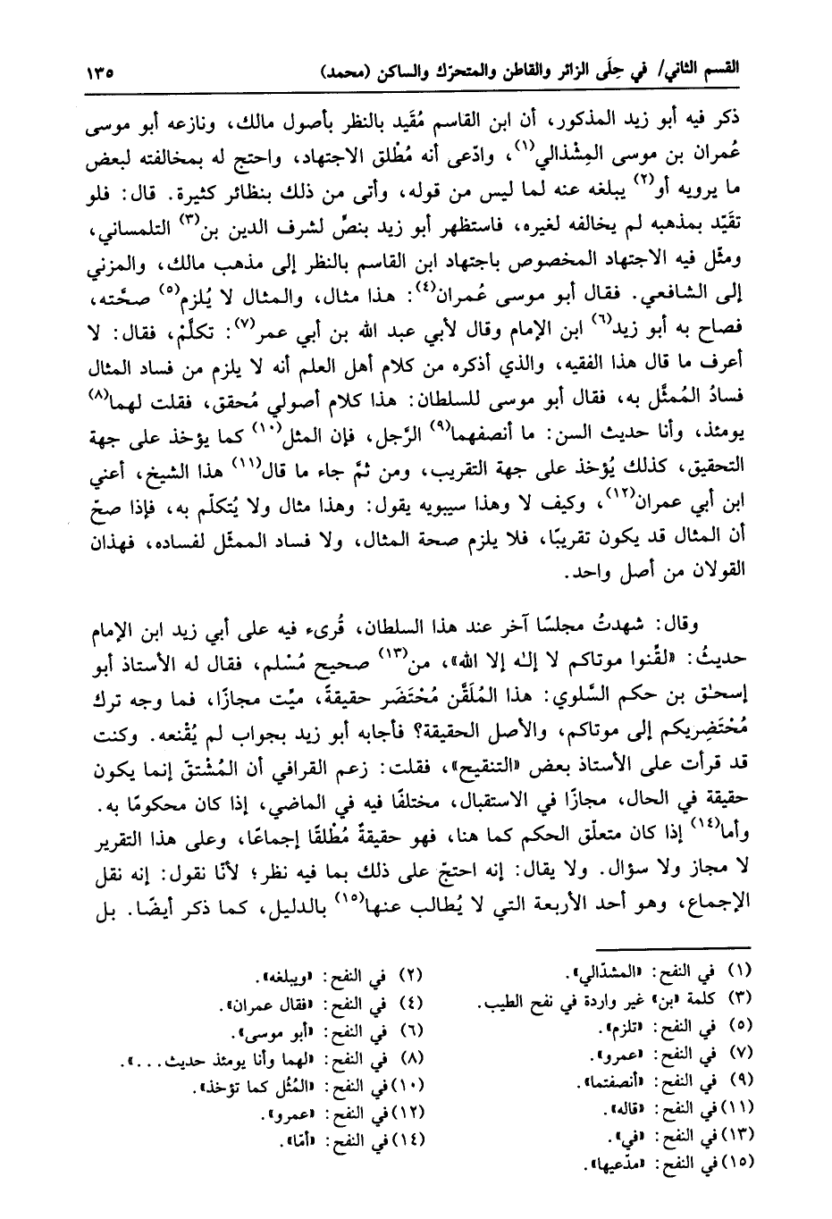 وقال: شهدت مجلسا آخر عند هذا السلطان، قرىء فيه على أبي زيد ابن الإمام حديث: «لقّنوا موتاكم لا إله إلا الله» ، من «13» صحيح مسلم، فقال له الأستاذ أبو إسحاق بن حكم السّلوي: هذا الملقّن محتضر حقيقة، ميّت مجازا، فما وجه ترك محتضريكم إلى موتاكم، والأصل الحقيقة؟ فأجابه أبو زيد بجواب لم يقنعه. وكنت قد قرأت على الأستاذ بعض «التنقيح» ، فقلت: زعم القرافي أن المشتقّ إنما يكون حقيقة في الحال، مجازا في الاستقبال، مختلفا فيه في الماضي، إذا كان محكوما به.