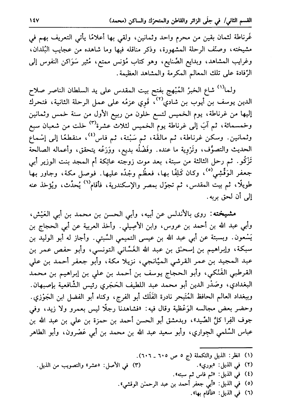 ولما «1» شاع الخبر المبهج بفتح بيت المقدس على يد السلطان الناصر صلاح الدين يوسف بن أيوب بن شادي «2» ، قوي عزمه على عمل الرحلة الثانية، فتحرك إليها من غرناطة، يوم الخميس لتسع خلون من ربيع الأول من سنة خمس وثمانين وخمسمائة، ثم آب إلى غرناطة يوم الخميس لثلاث عشرة «3» خلت من شعبان سبع وثمانين. وسكن غرناطة، ثم مالقة، ثم سبتة، ثم فاس «4» ، منقطعا إلى إسماع الحديث والتصوّف، وتروية ما عنده. وفضله بديع، وورعه يتحقق، وأعماله الصالحة تزكو. ثم رحل الثالثة من سبتة، بعد موت زوجته عاتكة أم المجد بنت الوزير أبي جعفر الوقّشي «5» ، وكان كلفا بها، فعظم وجده عليها. فوصل مكة، وجاور بها طويلا، ثم بيت المقدس، ثم تجوّل بمصر والإسكندرية، فأقام «6» يحدّث، ويؤخذ عنه إلى أن لحق بربه.