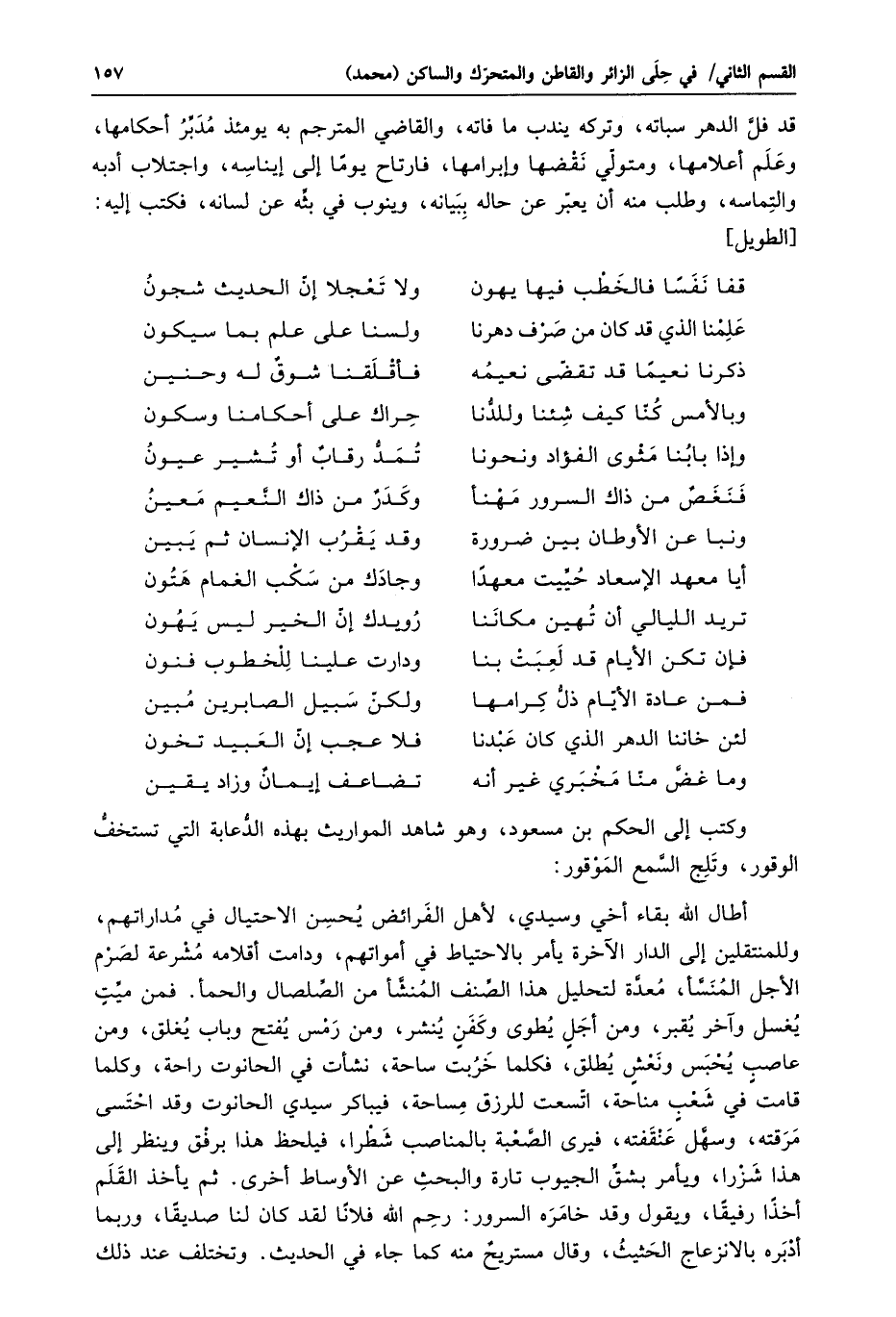 أطال الله بقاء أخي وسيدي، لأهل الفرائض يحسن الاحتيال في مداراتهم، وللمنتقلين إلى الدار الآخرة يأمر بالاحتياط في أمواتهم، ودامت أقلامه مشرعة لصرم الأجل المنسّأ، معدّة لتحليل هذا الصّنف المنشّأ من الصّلصال والحمأ. فمن ميّت يغسل وآخر يقبر، ومن أجل يطوى وكفن ينشر، ومن رمس يفتح وباب يغلق، ومن عاصب يحبس ونعش يطلق، فكلما خربت ساحة، نشأت في الحانوت راحة، وكلما قامت في شعب مناحة، اتّسعت للرزق مساحة، فيباكر سيدي الحانوت وقد احتسى مرقته، وسهّل عنقفته، فيرى الصّعبة بالمناصب شطرا، فيلحظ هذا برفق وينظر إلى هذا شزرا، ويأمر بشقّ الجيوب تارة والبحث عن الأوساط أخرى. ثم يأخذ القلم أخذا رفيقا، ويقول وقد خامره السرور: رحم الله فلانا لقد كان لنا صديقا، وربما أدبره بالانزعاج الحثيث، وقال مستريح منه كما جاء في الحديث. وتختلف عند ذلك