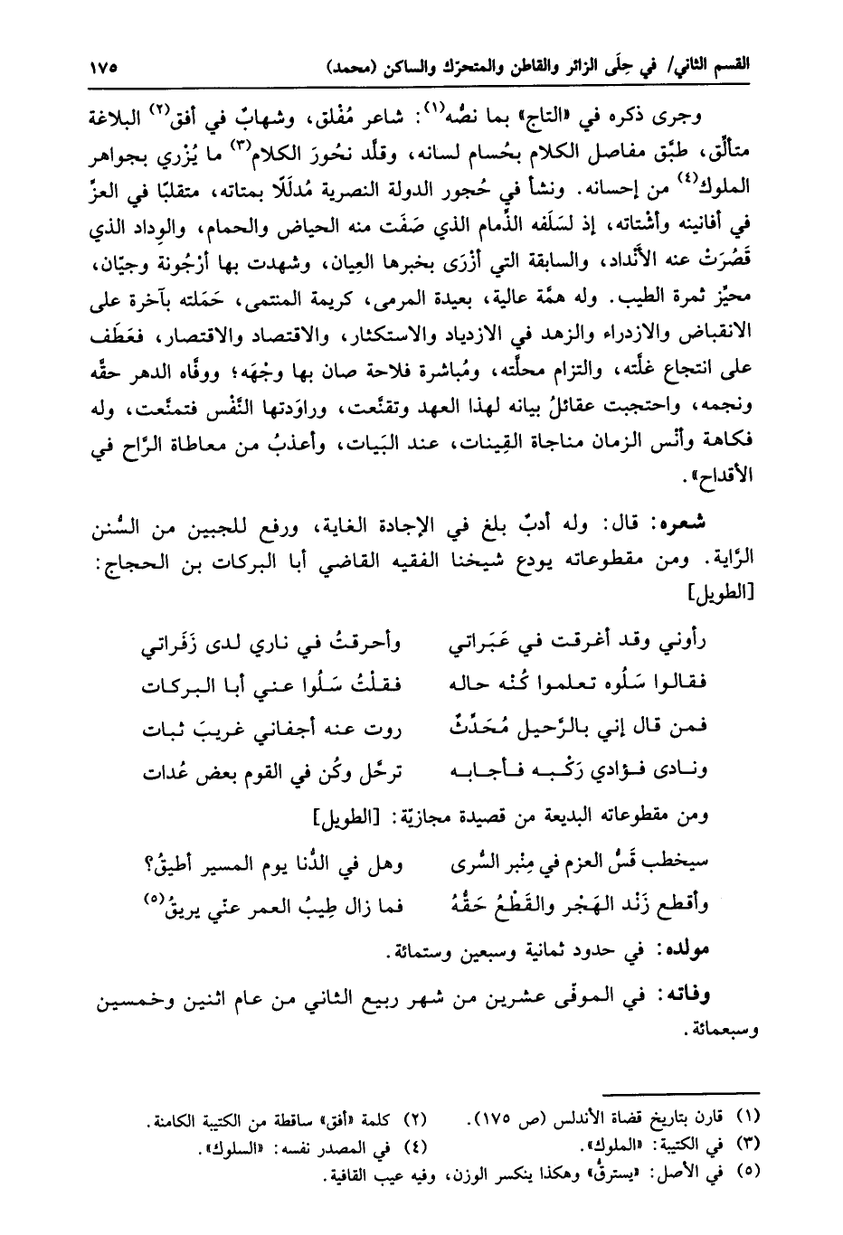 وجرى ذكره في «التاج» بما نصّه «1» : شاعر مفلق، وشهاب في أفق «2» البلاغة متألّق، طبّق مفاصل الكلام بحسام لسانه، وقلّد نحور الكلام «3» ما يزري بجواهر الملوك «4» من إحسانه. ونشأ في حجور الدولة النصرية مدللا بمتاته، متقلبا في العزّ في أفانينه وأشتاته، إذ لسلفه الذّمام الذي صفت منه الحياض والحمام، والوداد الذي قصرت عنه الأنداد، والسابقة التي أزرى بخبرها العيان، وشهدت بها أرجونة وجيّان، محيّز ثمرة الطيب. وله همّة عالية، بعيدة المرمى، كريمة المنتمى، حملته بآخرة على الانقباض والازدراء والزهد في الازدياد والاستكثار، والاقتصاد والاقتصار، فعطف على انتجاع غلّته، والتزام محلّته، ومباشرة فلاحة صان بها وجهه؛ ووفّاه الدهر حقّه ونجمه، واحتجبت عقائل بيانه لهذا العهد وتقنّعت، وراودتها النّفس فتمنّعت، وله فكاهة وأنس الزمان مناجاة القينات، عند البيات، وأعذب من معاطاة الرّاح في الأقداح» .