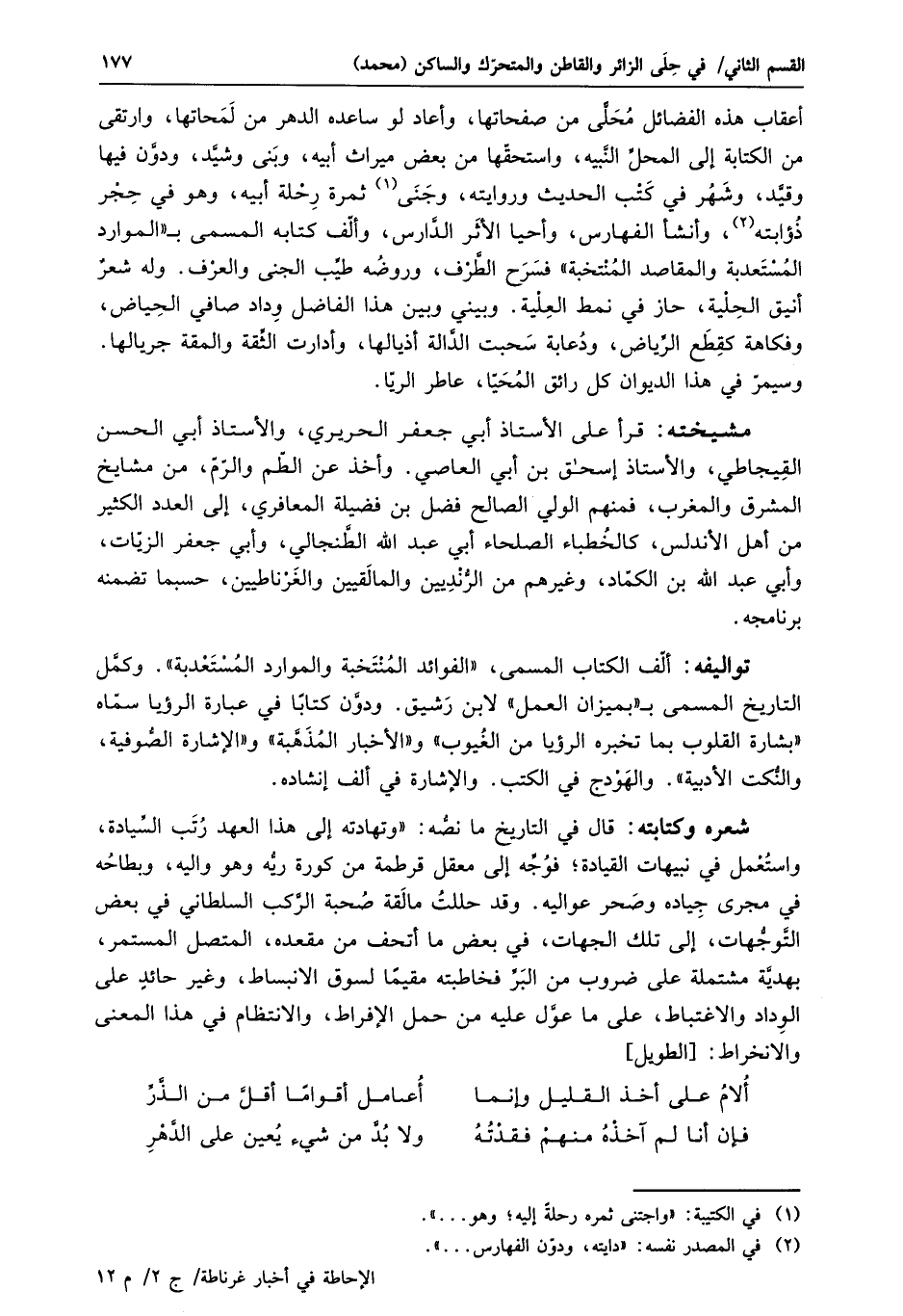 أعقاب هذه الفضائل محلّى من صفحاتها، وأعاد لو ساعده الدهر من لمحاتها، وارتقى من الكتابة إلى المحلّ النّبيه، واستحقّها من بعض ميراث أبيه، وبنى وشيّد، ودوّن فيها وقيّد، وشهر في كتب الحديث وروايته، وجنى «1» ثمرة رحلة أبيه، وهو في حجر ذؤابته «2» ، وأنشأ الفهارس، وأحيا الأثر الدّارس، وألّف كتابه المسمى ب «الموارد المستعدبة والمقاصد المنتخبة» فسرح الطّرف، وروضه طيّب الجنى والعرف. وله شعر أنيق الحلية، حاز في نمط العلية. وبيني وبين هذا الفاضل وداد صافي الحياض، وفكاهة كقطع الرّياض، ودعابة سحبت الدّالة أذيالها، وأدارت الثّقة والمقة جريالها.