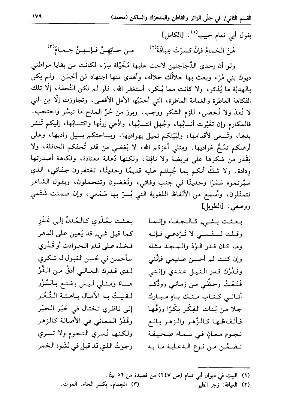 فالمكارم وإن تغيّرت أنسابها، وجهل انتسابها، وادّعي إرثها واكتسابها، إليكم تنشر يدها، وتسعى لأقدامها، ولبيتكم تميل بهواديها، وبساحتكم يسيل واديها، وعلى أرضكم تسحّ غواديها. ومثلي أعزكم الله، لا يغضي من قدر تحفكم الحافلة، ولا يقدر من شكرها على فريضة ولا نافلة، ولكنها دعابة معتادة، وفكاهة أصدرتها ودادة. ولا شكّ أنكم بما جبلتم عليه قديما وحديثا، تغتفرون جفائي، الذي سيّرتموه سمرا وحديثا في جنب وفائي، وتغضون وتتحملون، وبقول الشاعر تتمثّلون، وأسمع من الألفاظ اللغوية التي يسرّ بها سمعي، وإن ضمنت شتمي ووصفي: [الطويل]