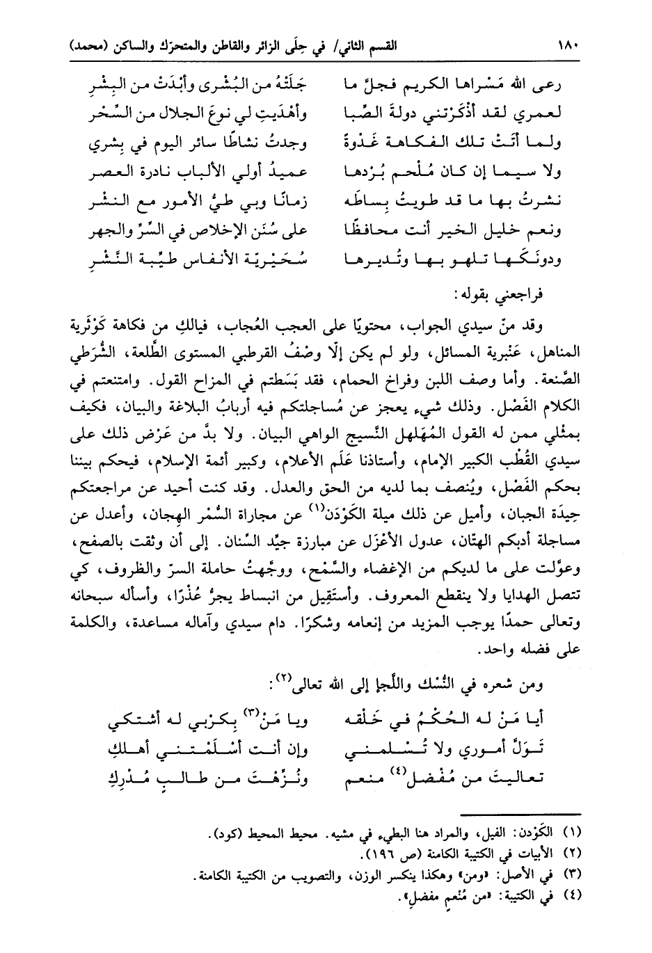 وقد منّ سيدي الجواب، محتويا على العجب العجاب، فيالك من فكاهة كوثرية المناهل، عنبرية المسائل، ولو لم يكن إلّا وصف القرطبي المستوى الطّلعة، الشّرطي الصّنعة. وأما وصف اللبن وفراخ الحمام، فقد بسطتم في المزاح القول. وامتنعتم في الكلام الفصل. وذلك شيء يعجز عن مساجلتكم فيه أرباب البلاغة والبيان، فكيف بمثلي ممن له القول المهلهل النّسيج الواهي البيان. ولا بدّ من عرض ذلك على سيدي القطب الكبير الإمام، وأستاذنا علم الأعلام، وكبير أئمة الإسلام، فيحكم بيننا بحكم الفصل، وينصف بما لديه من الحق والعدل. وقد كنت أحيد عن مراجعتكم حيدة الجبان، وأميل عن ذلك ميلة الكودن «1» عن مجاراة السّمر الهجان، وأعدل عن مساجلة أدبكم الهتّان، عدول الأعزل عن مبارزة جيّد السّنان. إلى أن وثقت بالصفح، وعوّلت على ما لديكم من الإغضاء والسّمح، ووجّهت حاملة السرّ والظروف، كي تتصل الهدايا ولا ينقطع المعروف. وأستقيل من انبساط يجرّ عذرا، وأسأله سبحانه وتعالى حمدا يوجب المزيد من إنعامه وشكرا. دام سيدي وآماله مساعدة، والكلمة على فضله واحد.