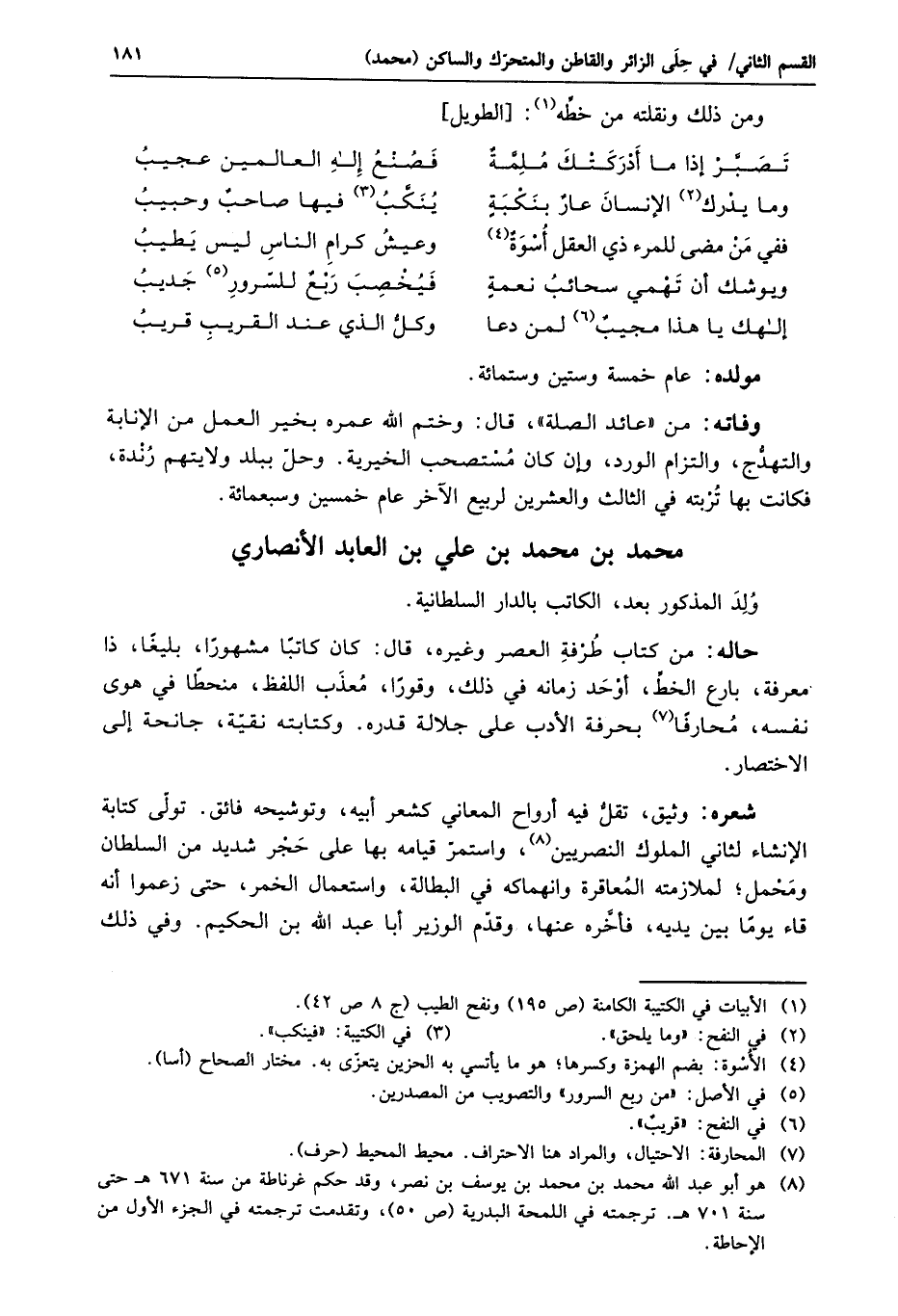 حاله: من كتاب طرفة العصر وغيره، قال: كان كاتبا مشهورا، بليغا، ذا معرفة، بارع الخطّ، أوحد زمانه في ذلك، وقورا، معذب اللفظ، منحطا في هوى نفسه، محارفا «7» بحرفة الأدب على جلالة قدره. وكتابته نقيّة، جانحة إلى الاختصار.