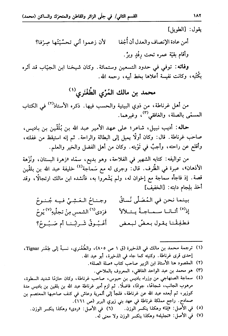 من تواليفه: كتابه الشهير في الفلاحة، وهو بديع، سمّاه «زهرة البستان، ونزهة الأذهان» ، عبرة في الظّرف. قال: وجرى له مع سماجة «4» خليفة عبد الله بن بلقّين قصة. إذ فاجأه سماجة مع إخوان له، ولم يشعروا به، فأنشده ابن مالك ارتجالا، وقد أخذ بلجام دابته: [الخفيف]