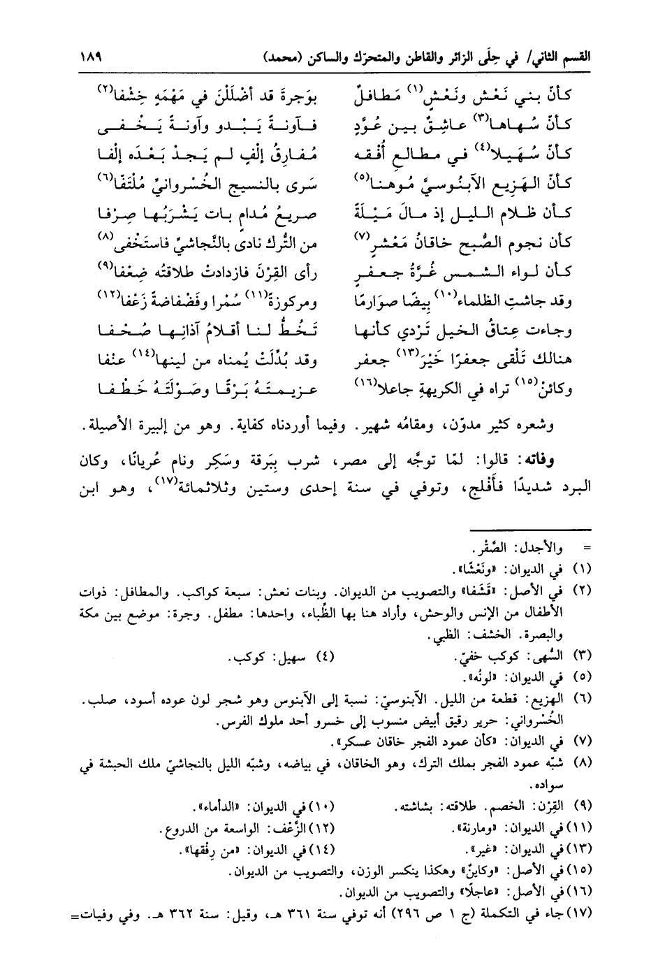 كأنّ الهزيع الآبنوسيّ موهنا «5» ... سرى بالنسيج الخسروانيّ ملتفّا «6»