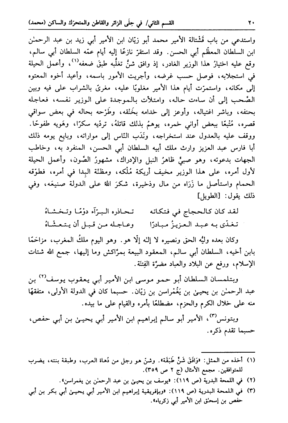 واستدعي من باب قشتالة الأمير محمد أبو زيّان ابن الأمير أبي زيد بن عبد الرحمن ابن السلطان المعظّم أبي الحسن. وقد استقرّ نازعا إليه أيام عمّه السلطان أبي سالم، وقع عليه اختيار هذا الوزير الغادر، إذ وافق شنّ تغلّبه طبق ضعفه «1» ، وأعمل الحيلة في استجلابه، فوصل حسب غرضه، وأجريت الأمور باسمه، وأعيد أخوه المعتوه إلى مكانه، واستمرّت أيام هذا الأمير مغلوبا عليه، مغرى بالشراب على فيه وبين الصّحب إلى أن ساءت حاله، وامتلأت بالموجدة على الوزير نفسه، فعاجله بحتفه، وباشر اغتياله، وأوعز إلى خدامه بخنقه، وطرحه بحاله في بعض سواقي قصره، متبعا ببعض أواني خمره، يوهم بذلك قاتله، تردّيه سكرا، وهويه طفوحا.
