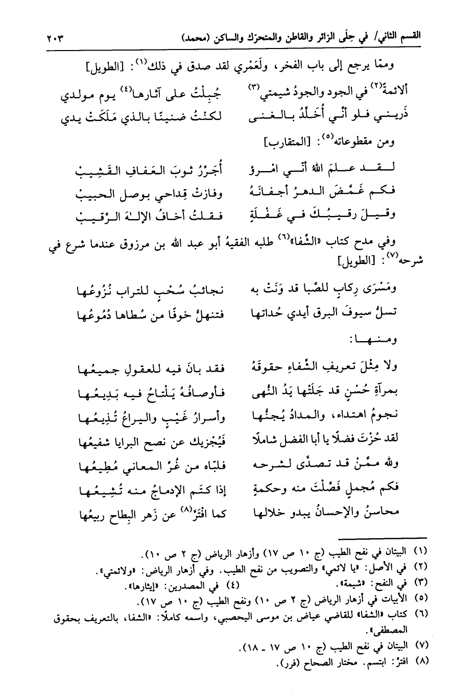 وفي مدح كتاب «الشّفا» «6» طلبه الفقيه أبو عبد الله بن مرزوق عندما شرع في شرحه «7» : [الطويل]