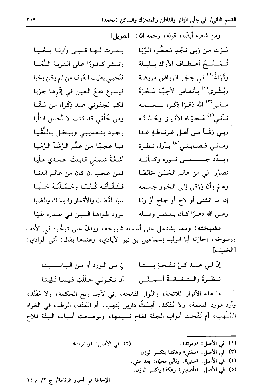 ما هذه الأنوار اللائحة، والنّوار الفائحة، إني لأجد ريح الحكمة، ولا مفنّد، وأرد مورد النعمة، ولا منكد، أمسك دارين ينهب، أم المندل الرطب في الغرام الملهب، أم نفحت أبواب الجنّة ففاح نسيمها، وتوضحت أسباب المنّة فلاح