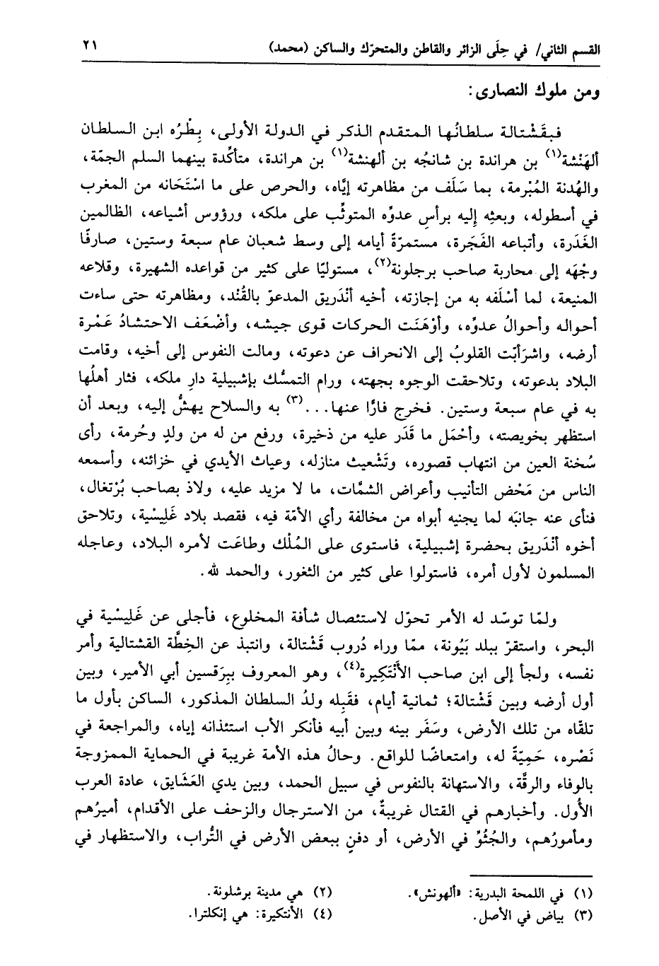 فبقشتالة سلطانها المتقدم الذكر في الدولة الأولى، بطره ابن السلطان ألهنشة «1» بن هراندة بن شانجه بن ألهنشة «2» بن هراندة، متأكّدة بينهما السلم الجمّة، والهدنة المبرمة، بما سلف من مظاهرته إيّاه، والحرص على ما استحانه من المغرب في أسطوله، وبعثه إليه برأس عدوّه المتوثّب على ملكه، ورؤوس أشياعه، الظالمين الغدرة، وأتباعه الفجرة، مستمرّة أيامه إلى وسط شعبان عام سبعة وستين، صارفا وجهه إلى محاربة صاحب برجلونة «3» ، مستوليا على كثير من قواعده الشهيرة، وقلاعه المنيعة، لما أسلفه به من إجازته، أخيه أندريق المدعوّ بالقند، ومظاهرته حتى ساءت أحواله وأحوال عدوّه، وأوهنت الحركات قوى جيشه، وأضعف الاحتشاد عمرة أرضه، واشرأبّت القلوب إلى الانحراف عن دعوته، ومالت النفوس إلى أخيه، وقامت البلاد بدعوته، وتلاحقت الوجوه بجهته، ورام التمسّك بإشبيلية دار ملكه، فثار أهلها به في عام سبعة وستين. فخرج فارّا عنها ... «4» به والسلاح يهشّ إليه، وبعد أن استظهر بخويصته، وأحمل ما قدر عليه من ذخيرة، ورفع من له من ولد وحرمة، رأى سخنة العين من انتهاب قصوره، وتشعيث منازله، وعياث الأيدي في خزائنه، وأسمعه الناس من محض التأنيب وأعراض الشمّات، ما لا مزيد عليه، ولاذ بصاحب برتغال، فنأى عنه جانبه لما يجنيه أبواه من مخالفة رأي الأمّة فيه، فقصد بلاد غليسية، وتلاحق أخوه أندريق بحضرة إشبيلية، فاستوى على الملك وطاعت لأمره البلاد، وعاجله المسلمون لأول أمره، فاستولوا على كثير من الثغور، والحمد لله.