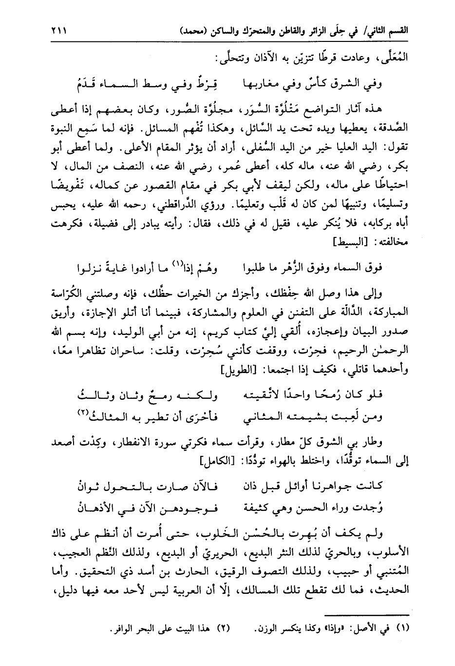 ولم يكف أن بهرت بالحسن الخلوب، حتى أمرت أن أنظم على ذاك الأسلوب، وبالحريّ لذلك النثر البديع، الحريريّ أو البديع، ولذلك النّظم العجيب، المتنبي أو حبيب، ولذلك التصوف الرقيق، الحارث بن أسد ذي التحقيق. وأما الحديث، فما لك تقطع تلك المسالك، إلّا أن العربية ليس لأحد معه فيها دليل،