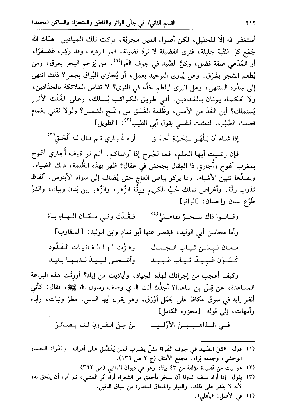 أستغفر الله إلّا للخليل، لكن أصول الدين مجريّة، تركت تلك الميادين. هنّاك الله جمع كل منقبة جليلة، فترى الفضيلة لا تردّ فضيلة، فمر الرديف وقد ركب غضنفرا، أو المدّعي صفة فضل، وكلّ الصّيد في جوف الفرا «1» . من يزحم البحر يغرق، ومن يطعم الشجر يشرق. وهل يبارى التوحيد بعمل، أو يجارى البراق بجمل؟ ذلك انتهى إلى سدرة المنتهى، وهل انبرى ليلطم خدّه في الثرى؟ لا تقاس الملائكة بالحدّادين، ولا حكماء يونان بالفدادين. أفي طريق الكواكب يسلك، وعلى الفلك الأثير يستملك؟ أين الغد من الأمس، وظلمة الغسق من وضح الشمس؟ ولولا ثقتي بغمام فضلك الصّيّب، لتمثلت لنفسي بقول أبي الطيب «2» : [الطويل]