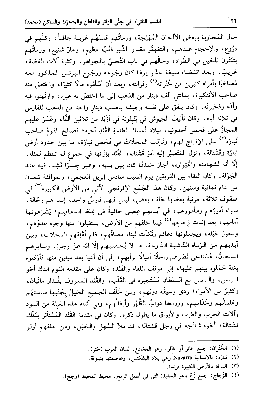 حال المحاربة ببعض الألحان المهيّجة، ورماتهم قسيّهم غريبة جافية، وكلّهم في دروع، والإحجام عندهم، والتقهقر مقدار الشّبر ذنب عظيم، وعار شنيع، ورماتهم يثبتون للخيل في الطّراد، وحالهم في باب التّحليّ بالجواهر، وكثرة آلات الفضة، غريب. وبعد انقضاء سبعة عشر يوما كان رجوعه ورجوع البرنس المذكور معه مصاحبا بأمراء كثيرين من خترانه «1» وقرابته، وبعد أن أسلفوه مالا كثيرا، واختصّ منه صاحب الأنتكيرة، بمائتي ألف دينار من الذهب إلى ما اختصّ به غيره، وارتهنوا فيه ولده وذخيرته. وكان ينفق على نفسه وجيشه بحسب دينار واحد من الذهب للفارس في ثلاثة أيام. وكان تأليف الجيوش في بنبلونة في أزيد من ثلاثين ألفا، وعسر عليهم المجاز على فحص أحدونيه، لبلاد تمسك لطاعة القند أخيه؛ فصالح القوم صاحب نبارّه «2» على الإفراج لهم، ونزلت المحلّات في فحص نبارّة، ما بين حدود أرض نبارّة وقشتالة، ونزل المتصيّر إليه أمر قشتاله، القند بإزائها في جموع لم تنتظم لمثله، إلّا أنه لشهامته واغتراره، أجاز خندقا كان بين يديه، وعبر جسرا نشب فيه عند الجولة. وكان اللقاء بين الفريقين يوم السبت سادس إبريل العجمي، وبموافقة شعبان من عام ثمانية وستين. وكان هذا الجمع الإفرنجي الآتي من الأرض الكبيرة «3» في صفوف ثلاثة، مرتبة بعضها خلف بعض، ليس فيهم فارس واحد، إنما هم رجّالة، سواء أميرهم ومأمورهم، في أيديهم عصي جافية في غلظ المعاصم؛ يشرعونها أمامهم، بعد إثبات زجاجها «4» فيما خلفهم من الأرض، يستقبلون منها وجوه عدوّهم، ونحور خيله، ويجعلونها دعائم وتكآت لبناء مصافّهم، فلم تقلقهم المحلات، وبين أيديهم من الرّماه النّاشبة الدّارعة، ما لا يحصيهم إلّا الله عزّ وجلّ. وسايرهم السلطان، مستدعى نصرهم راجلا أميالا برأيهم؛ إلى أن أعيا بعد ميلين منها فأركبوه بغلة حملوه بينهم عليها، إلى موقف اللقاء والقند، وكان على مقدمة القوم الدك أخو البرنس، والبرنس مع السلطان مستجيره في القلب، والقند المعروف بقند أرمانيان، وكثير من الأمراء؛ ردى وسيفه دونهم، ومن خلف الجميع الخيل بجنبها ساستهم وغلمانهم وخدّامهم، ووراءها دوابّ الظّهر وأبغالهم، وفي أثناء هذه العبيّة من البنود وآلات الحرب والطرب والأبواق ما يطول ذكره. وكان في مقدمة القند المستأثر بملك قشتالة؛ أخوه شانجه في رجل قشتالة، قد ملأ السّهل والجبل، ومن خلفهم أولو