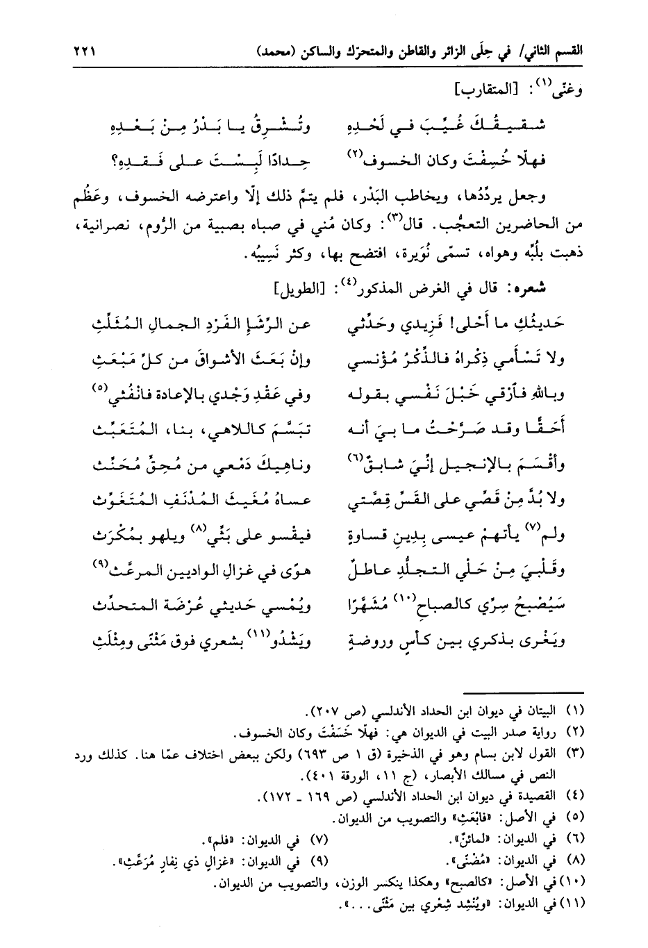 وجعل يردّدها، ويخاطب البدر، فلم يتمّ ذلك إلّا واعترضه الخسوف، وعظم من الحاضرين التعجّب. قال «3» : وكان مني في صباه بصبية من الرّوم، نصرانية، ذهبت بلبّه وهواه، تسمّى نويرة، افتضح بها، وكثر نسيبه.