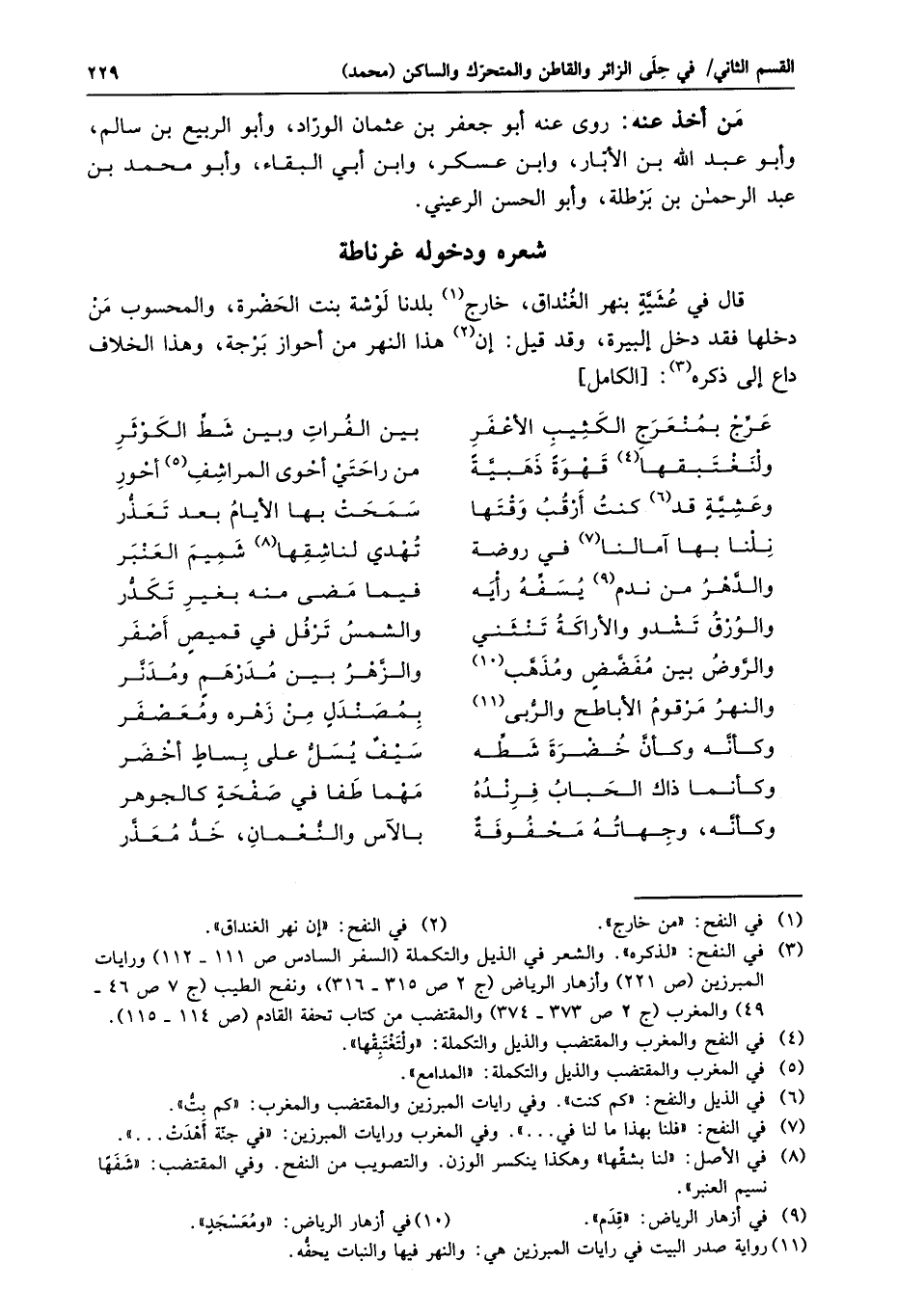 قال في عشيّة بنهر الغنداق، خارج «1» بلدنا لوشة بنت الحضرة، والمحسوب من دخلها فقد دخل إلبيرة، وقد قيل: إن «2» هذا النهر من أحواز برجة، وهذا الخلاف داع إلى ذكره «3» : [الكامل]