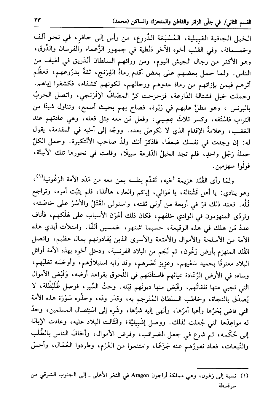 الخيل الجافية القبيلية، المسبغة الدّروع، من رأس إلى حافر، في نحو ألف وخمسمائة، وفي القلب أخوه الآخر دنطية في جمهور الزّعماء والفرسان والدّرق، وهو الأكثر من رجال الجيش اليوم، ومن ورائهم السلطان أندريق في لفيف من الناس. ولما حمل بعضهم على بعض أقدم رماة الفرنج، ثقة بدروعهم، فعظم أثرهم فيمن بإزائهم من رماة عدوهم ورجالهم، لكونهم كشفاء، فكشفوا إياهم.