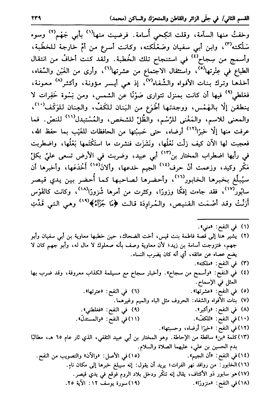 وخفت منها السآمة، وقلت انكحي أسامة. فرضيت منها «1» بأبي جهم «2» وسوء سلكته «3» ، وابن أبي سفيان وصعلكته، وكانت أسرع من أمّ خارجة للخطبة، وأسمج من سجاح «4» في استنجاح تلك الخطبة. ولقد كنت أخاف من انتقال الطباع في عترتها «5» ، واستثقال الاجتماع من عشرتها «6» ، وأرى من الغبن والسّفاه، أخذها وترك بنات الأفواه والشّفاه «7» ، إذ هي أيسر مؤونة، وأكثر «8» معونة، فغلطي «9» فيها أن كانت بمنزل تتوارى صونا عن الشمس، ومن نسوة خفرات لا ينطقن إلّا بالهمس، ووجدتها أطوع من البنان للكفّ، والعنان للوكف «10» ، والمعنى للاسم، والمغنى للرّسم، والظّلّ للشخص، والمستبدل «11» للنصّ. فما عرفت منها إلّا خبرا «12» أرضاه، حتى حسبتها من الحافظات للغيب بما حفظ الله، فعجبت لها الآن كيف زلّت نعلها، ونشزت فنشرت ما استكتمها بعلها، واضطربت في رأيها اضطراب المختار بن «13» أبي عبيد، وضربت في الأرض تسعى عليّ بكلّ مكر وكيد، وزعمت أنّ حرف «14» الجيم خدعها، وألان «15» أخدعها، وأخبرها أن سيبلّغ بخبرها الخابور «16» ، وأحضرها لصاحبها كما أحضر بين يدي قيصر سابور «17» ، فقد جاءت إفكا وزورا، وكثرت من أمرها شزورا «18» ، وكانت كالقوس أرنّت وقد أصمت القنيص، والمراودة قالت ما جَزاءُ