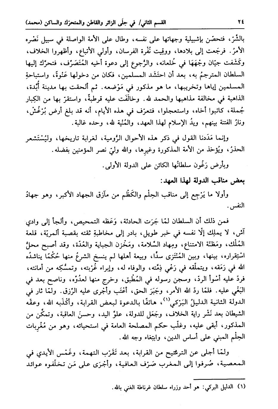 فمن ذلك أن السلطان لمّا جرت الحادثة، وعظه التمحيص، وألجأ إلى وادي آش، لا يملك إلّا نفسه في خبر طويل، بادر إلى مخاطبة ثقته بقصبة ألمريّة، قلعة الملك، ومظنّة الامتناع، ومهاد السّلامة، ومخزن الجباية والعدّة، وقد أصبح محلّ استقراره، بينها، وبين المنتزى سدّا، وبيعة أهلها لم ينسخ الشرع منها حكما يناشده الله في رمقه، ويتملّقه في رعي ذمّته، والوفاء له، وإبراء غربته، وتمسّكه من أمانته، فردّ عليه أسوأ الردّ، وسجن رسوله في المطبق، وخرج منها لعدوّه، وناصح بعد في البغي عليه. فلمّا ردّ الله الأمر، وجبر الحق، أعتب وأجرى عليه الرّزق. ولمّا ثار في الدولة الثانية الدليل البركي «1» ، هاتفا بالدعوة لبعض القرابة، وأكذبه الله، وعقّه الشيطان بعد نشر راية الخلاف، وجعل للدولة، علوّ اليد، وحسن العاقبة، وتمكّن من المذكور، أبقى عليه، وغلّب حكم المصلحة العامة في استحيائه، وهو من مغربات الحلم المبني على أساس الدين، وابتغاء وجه الله.