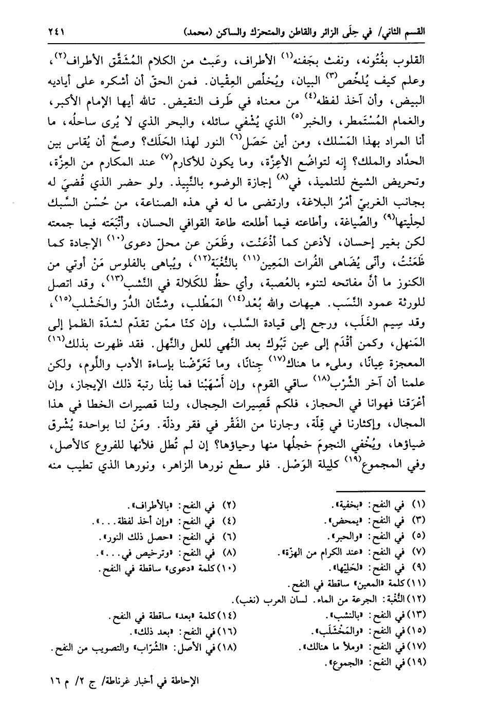 القلوب بفتونه، ونفث بجفنه «1» الأطراف، وعبث من الكلام المشقّق الأطراف «2» ، وعلم كيف يلخّص «3» البيان، ويخلّص العقيان. فمن الحقّ أن أشكره على أياديه البيض، وأن آخذ لفظه «4» من معناه في طرف النقيض. تالله أيها الإمام الأكبر، والغمام المستمطر، والخبر «5» الذي يشفي سائله، والبحر الذي لا يرى ساحله، ما أنا المراد بهذا المسلك، ومن أين حصل «6» النور لهذا الحلك؟ وصحّ أن يقاس بين الحدّاد والملك؟ إنه لتواضع الأعزّة، وما يكون للأكارم «7» عند المكارم من العزّة، وتحريض الشيخ للتلميذ، في «8» إجازة الوضوء بالنّبيذ. ولو حضر الذي قضي له بجانب الغربيّ أمر البلاغة، وارتضى ما له في هذه الصناعة، من حسن السّبك لحليتها «9» والصّياغة، وأطاعته فيما أطلعته طاعة القوافي الحسان، وأتبعته فيما جمعته لكن بغير إحسان، لأذعن كما أذعنت، وظعن عن محلّ دعوى «10» الإجادة كما ظعنت، وأنّى يضاهى الفرات المعين «11» بالنّغبة «12» ، ويباهى بالفلوس من أوتي من الكنوز ما أنّ مفاتحه لتنوء بالعصبة، وأي حظّ للكلالة في النّشب «13» ، وقد اتصل للورثة عمود النّسب. هيهات والله بعد «14» المطلب، وشتّان الدّرّ والخشلب «15» ، وقد سيم الغلب، ورجع إلى قيادة السّلب، وإن كنّا ممّن تقدّم لشدّة الظمإ إلى المنهل، وكمن أقدم إلى عين تبوك بعد النّهي للعل والنّهل. فقد ظهرت بذلك «16» المعجزة عيانا، وملئ ما هناك «17» جنانا، وما تعرّضنا بإساءة الأدب واللّوم، ولكن علمنا أن آخر الشّرب «18» ساقي القوم، وإن أسهبنا فما نلنا رتبة ذلك الإيجاز، وإن أعرقنا فهوانا في الحجاز، فلكم قصيرات الحجال، ولنا قصيرات الخطا في هذا المجال، وإكثارنا في قلّة، وجارنا من الفقر في فقر وذلّة. ومن لنا بواحدة يشرق ضياؤها، ويخفي النجوم خجلها منها وحياؤها؟ إن لم تطل فلأنها للفروع كالأصل، وفي المجموع «19» كليلة الوصل. فلو سطع نورها الزاهر، ونورها الذي تطيب منه