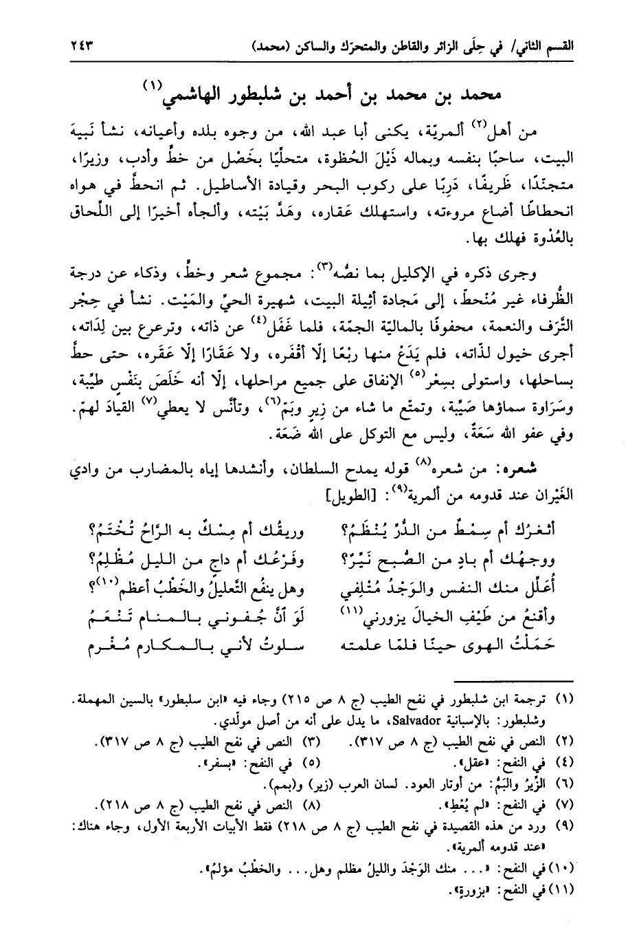 من أهل «2» ألمريّة، يكنى أبا عبد الله، من وجوه بلده وأعيانه، نشأ نبيه البيت، ساحبا بنفسه وبماله ذيل الحظوة، متحلّيا بخصل من خطّ وأدب، وزيرا، متجنّدا، ظريفا، دربا على ركوب البحر وقيادة الأساطيل. ثم انحطّ في هواه انحطاطا أضاع مروءته، واستهلك عقاره، وهدّ بيته، وألجأه أخيرا إلى اللّحاق بالعدوة فهلك بها.