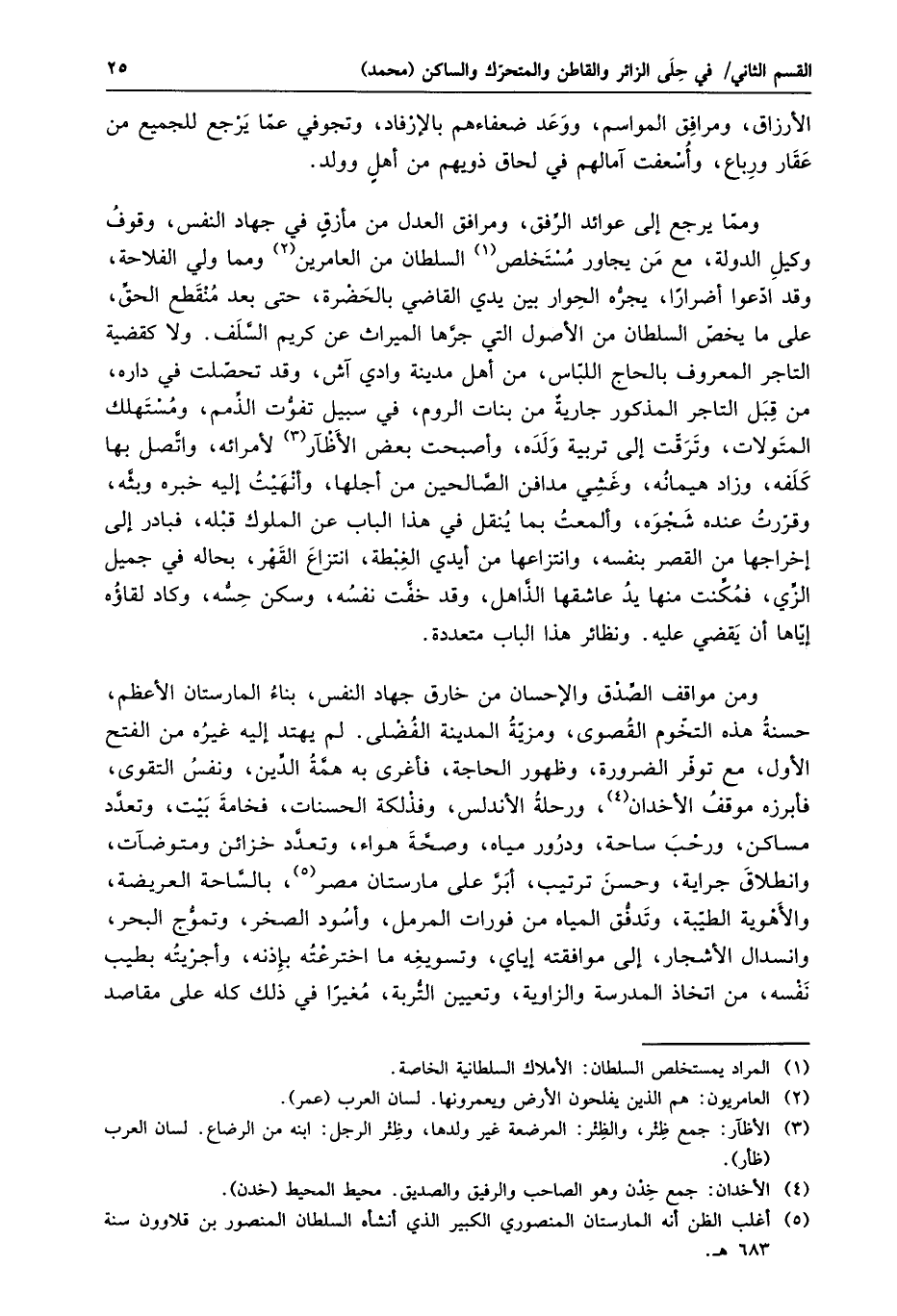 ومن مواقف الصّدق والإحسان من خارق جهاد النفس، بناء المارستان الأعظم، حسنة هذه التخوّم القصوى، ومزيّة المدينة الفضلى. لم يهتد إليه غيره من الفتح الأول، مع توفّر الضرورة، وظهور الحاجة، فأغرى به همّة الدّين، ونفس التقوى، فأبرزه موقف الأخدان «4» ، ورحلة الأندلس، وفذلكة الحسنات، فخامة بيت، وتعدّد مساكن، ورحب ساحة، ودرور مياه، وصحّة هواء، وتعدّد خزائن ومتوضآت، وانطلاق جراية، وحسن ترتيب، أبرّ على مارستان مصر «5» ، بالسّاحة العريضة، والأهوية الطيّبة، وتدفّق المياه من فورات المرمل، وأسود الصخر، وتموّج البحر، وانسدال الأشجار، إلى موافقته إياي، وتسويغه ما اخترعته بإذنه، وأجريته بطيب نفسه، من اتخاذ المدرسة والزاوية، وتعيين التّربة، مغيرا في ذلك كله على مقاصد