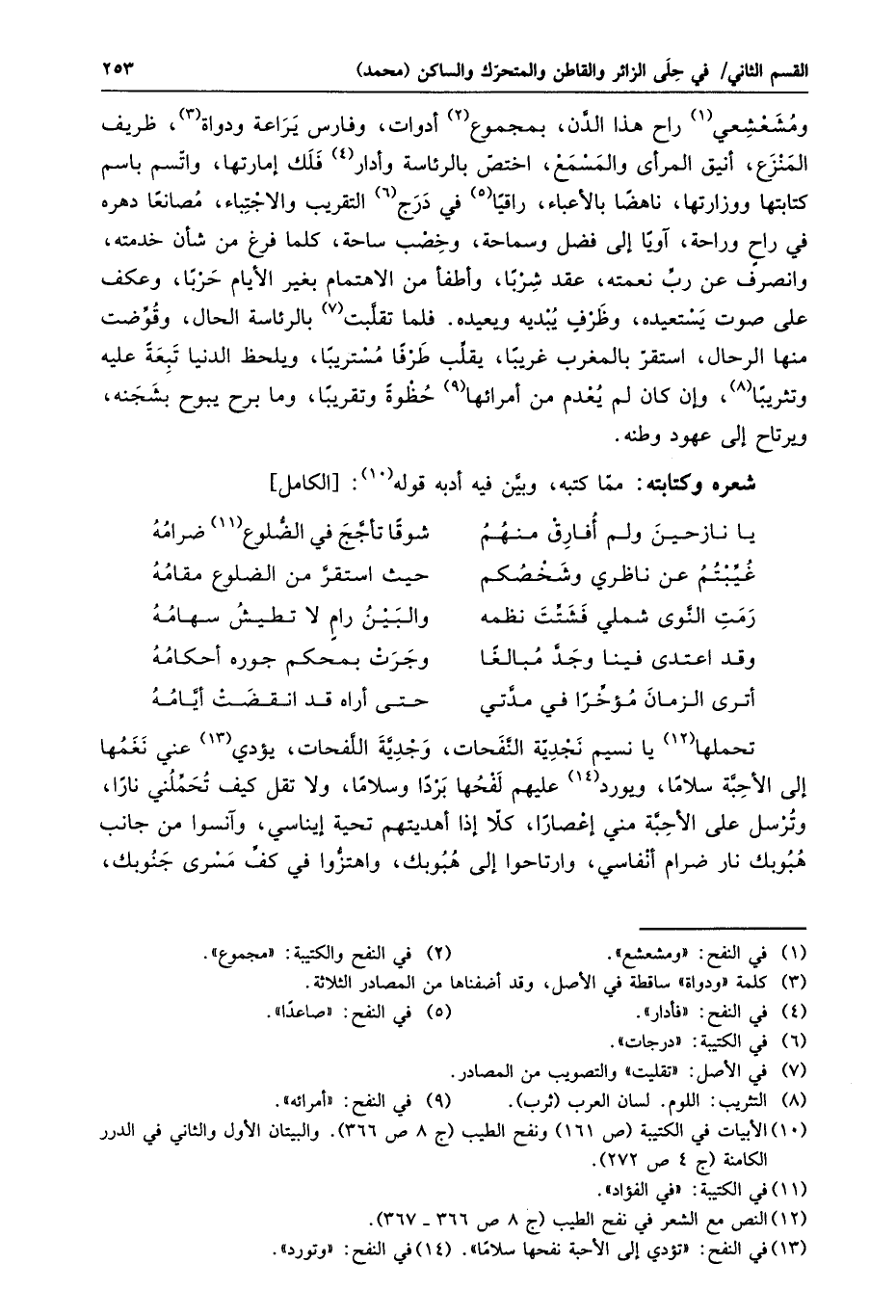 تحملها «12» يا نسيم نجديّة النّفحات، وجديّة اللّفحات، يؤدي «13» عني نغمها إلى الأحبّة سلاما، ويورد «14» عليهم لفحها بردا وسلاما، ولا تقل كيف تحمّلني نارا، وترسل على الأحبّة مني إعصارا، كلّا إذا أهديتهم تحية إيناسي، وآنسوا من جانب هبوبك نار ضرام أنفاسي، وارتاحوا إلى هبوبك، واهتزّوا في كفّ مسرى جنوبك،
