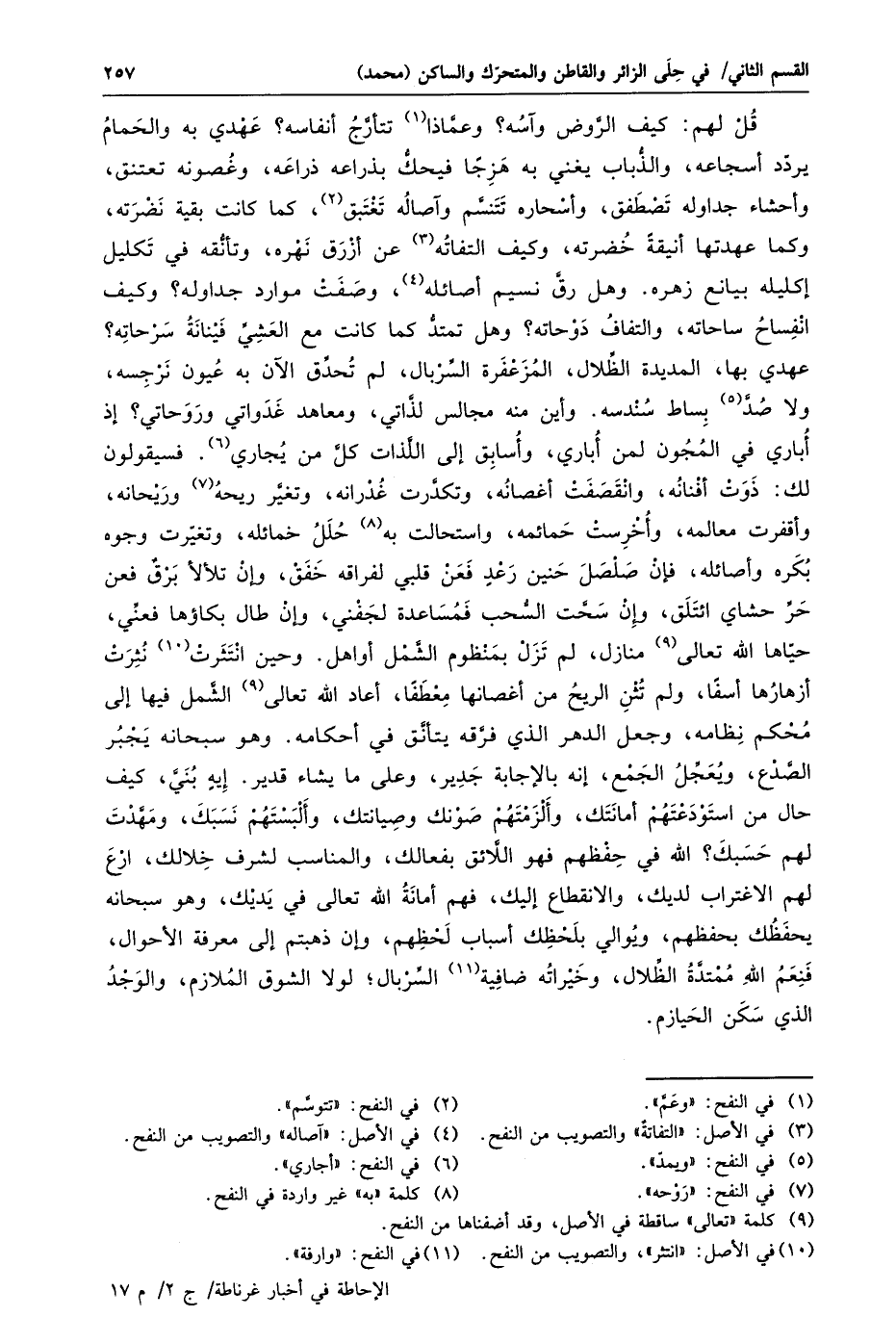 قل لهم: كيف الرّوض وآسه؟ وعمّاذا «1» تتأرّج أنفاسه؟ عهدي به والحمام يردّد أسجاعه، والذّباب يغني به هزجا فيحكّ بذراعه ذراعه، وغصونه تعتنق، وأحشاء جداوله تصطفق، وأسحاره تتنسّم وآصاله تغتبق «2» ، كما كانت بقية نضرته، وكما عهدتها أنيقة خضرته، وكيف التفاته «3» عن أزرق نهره، وتأنّقه في تكليل إكليله بيانع زهره. وهل رقّ نسيم أصائله «4» ، وصفت موارد جداوله؟ وكيف انفساح ساحاته، والتفاف دوحاته؟ وهل تمتدّ كما كانت مع العشيّ فينانة سرحاته؟