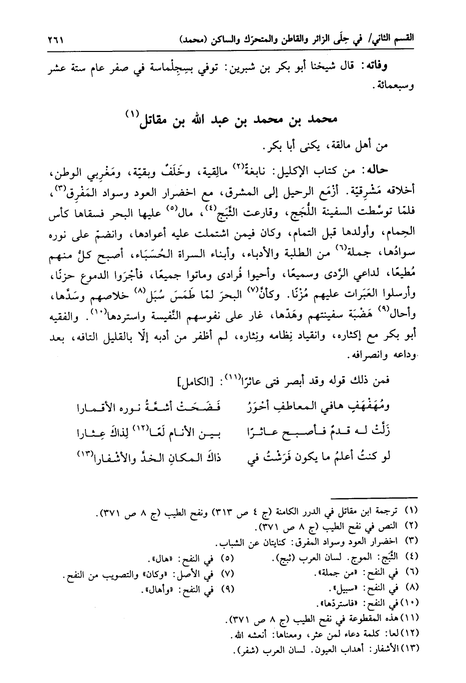 حاله: من كتاب الإكليل: نابغة «2» مالقية، وخلف وبقيّة، ومغربي الوطن، أخلاقه مشرقيّة. أزمع الرحيل إلى المشرق، مع اخضرار العود وسواد المفرق «3» ، فلمّا توسّطت السفينة اللّجج، وقارعت الثّبج «4» ، مال «5» عليها البحر فسقاها كأس الحمام، وأولدها قبل التمام، وكان فيمن اشتملت عليه أعوادها، وانضمّ على نوره سوادها، جملة «6» من الطلبة والأدباء، وأبناء السراة الحسباء، أصبح كلّ منهم مطيعا، لداعي الرّدى وسميعا، وأحيوا فرادى وماتوا جميعا، فأجروا الدموع حزنا، وأرسلوا العبرات عليهم مزنا. وكأنّ «7» البحر لمّا طمس سبل «8» خلاصهم وسدّها، وأحال «9» هضبة سفينتهم وهدّها، غار على نفوسهم النّفيسة واستردها «10» . والفقيه أبو بكر مع إكثاره، وانقياد نظامه ونثاره، لم أظفر من أدبه إلّا بالقليل التافه، بعد وداعه وانصرافه.