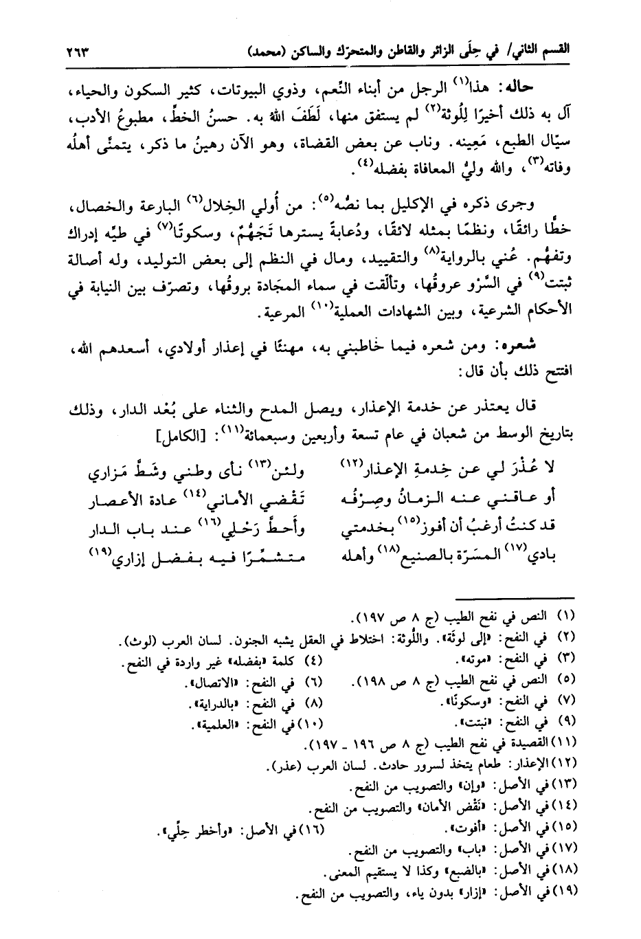 قال يعتذر عن خدمة الإعذار، ويصل المدح والثناء على بعد الدار، وذلك بتاريخ الوسط من شعبان في عام تسعة وأربعين وسبعمائة «11» : [الكامل]