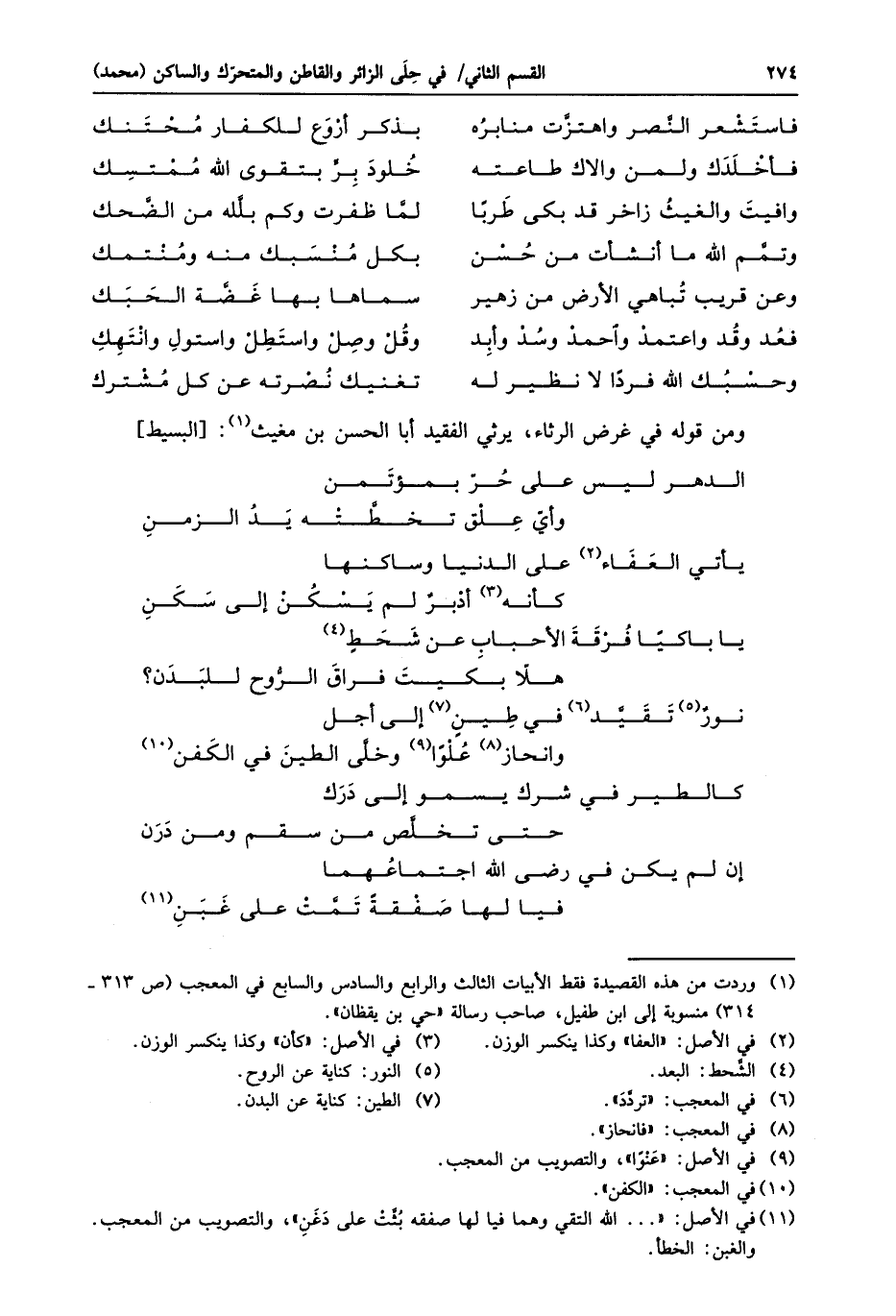 نور «5» تقيّد «6» في طين «7» إلى أجل ... وانحاز «8» علوا «9» وخلّى الطين في الكفن «10»