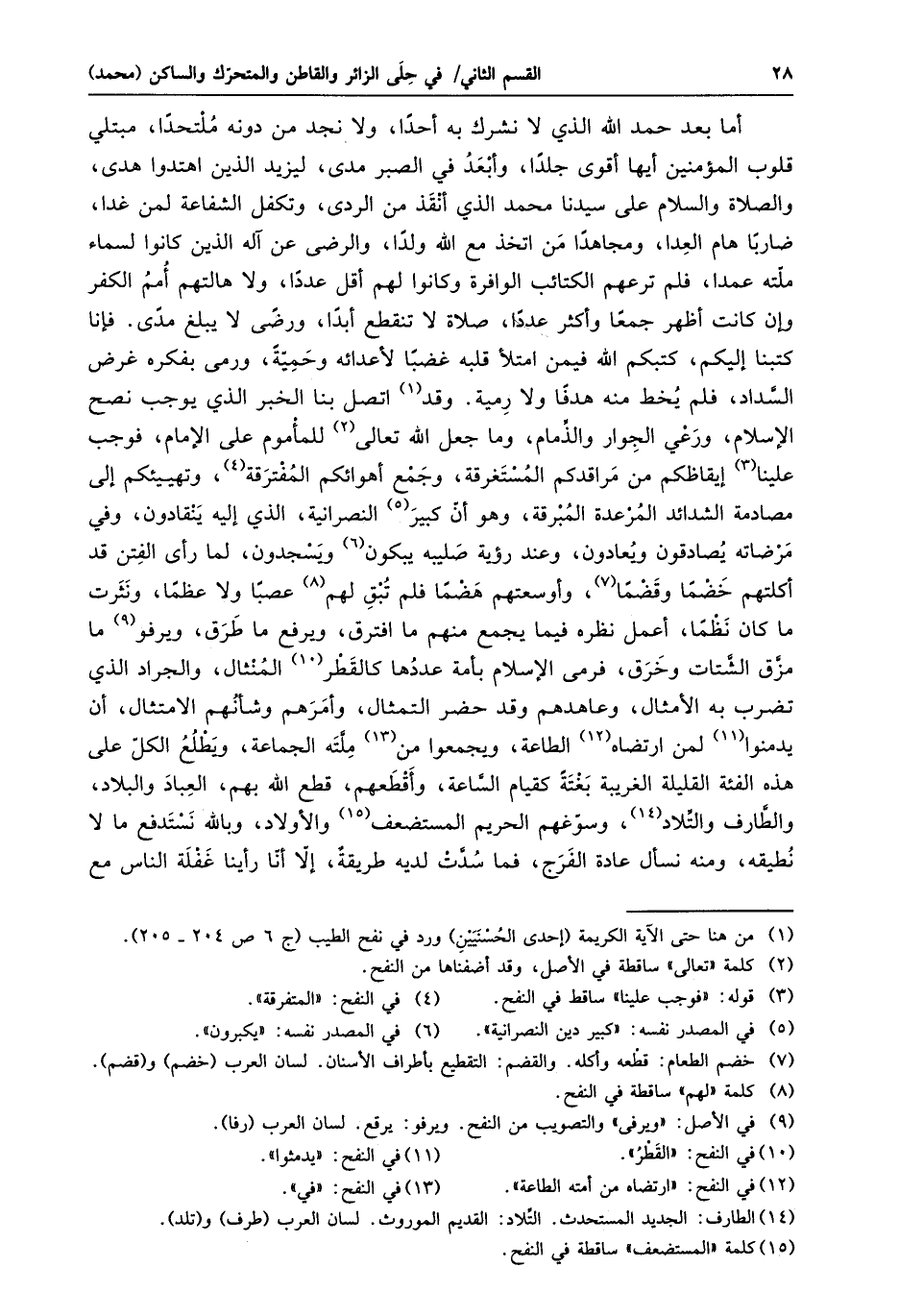 أما بعد حمد الله الذي لا نشرك به أحدا، ولا نجد من دونه ملتحدا، مبتلي قلوب المؤمنين أيها أقوى جلدا، وأبعد في الصبر مدى، ليزيد الذين اهتدوا هدى، والصلاة والسلام على سيدنا محمد الذي أنقذ من الردى، وتكفل الشفاعة لمن غدا، ضاربا هام العدا، ومجاهدا من اتخذ مع الله ولدا، والرضى عن آله الذين كانوا لسماء ملّته عمدا، فلم ترعهم الكتائب الوافرة وكانوا لهم أقل عددا، ولا هالتهم أمم الكفر وإن كانت أظهر جمعا وأكثر عددا، صلاة لا تنقطع أبدا، ورضى لا يبلغ مدى. فإنا كتبنا إليكم، كتبكم الله فيمن امتلأ قلبه غضبا لأعدائه وحميّة، ورمى بفكره غرض السّداد، فلم يخط منه هدفا ولا رمية. وقد «1» اتصل بنا الخبر الذي يوجب نصح الإسلام، ورعي الجوار والذّمام، وما جعل الله تعالى «2» للمأموم على الإمام، فوجب علينا «3» إيقاظكم من مراقدكم المستغرقة، وجمع أهوائكم المفترقة «4» ، وتهييئكم إلى مصادمة الشدائد المرعدة المبرقة، وهو أنّ كبير «5» النصرانية، الذي إليه ينقادون، وفي مرضاته يصادقون ويعادون، وعند رؤية صليبه يبكون «6» ويسجدون، لما رأى الفتن قد أكلتهم خضما وقضما «7» ، وأوسعتهم هضما فلم تبق لهم «8» عصبا ولا عظما، ونثرت ما كان نظما، أعمل نظره فيما يجمع منهم ما افترق، ويرفع ما طرق، ويرفو «9» ما مزّق الشّتات وخرق، فرمى الإسلام بأمة عددها كالقطر «10» المنثال، والجراد الذي تضرب به الأمثال، وعاهدهم وقد حضر التمثال، وأمرهم وشأنهم الامتثال، أن يدمنوا «11» لمن ارتضاه «12» الطاعة، ويجمعوا من «13» ملّته الجماعة، ويطلع الكلّ على هذه الفئة القليلة الغريبة بغتة كقيام السّاعة، وأقطعهم، قطع الله بهم، العباد والبلاد، والطّارف والتّلاد «14» ، وسوّغهم الحريم المستضعف «15» والأولاد، وبالله نستدفع ما لا نطيقه، ومنه نسأل عادة الفرج، فما سدّت لديه طريقة، إلّا أنّا رأينا غفلة الناس مع