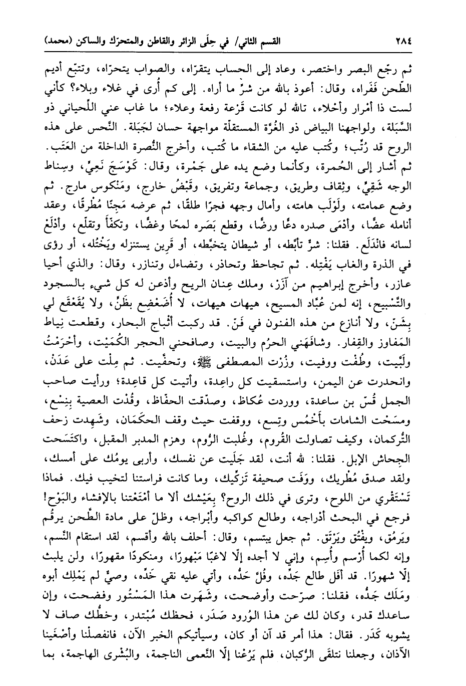 ثم رجّع البصر واختصر، وعاد إلى الحساب يتقرّاه، والصواب يتحرّاه، وتتبّع أديم الطّحن ففراه، وقال: أعوذ بالله من شرّ ما أراه. إلى كم أرى في غلاء وبلاء؟ كأني لست ذا أمرار وأحلاء، تالله لو كانت قرعة رفعة وعلاء؛ ما غاب عني اللّحياني ذو السّبلة، ولواجهنا البياض ذو الغرّة المستقلّة مواجهة حسان لجبلة. النّحس على هذه الروح قد رتّب؛ وكتب عليه من الشقاء ما كتب، وأخرج النّصرة الداخلة من العتب.