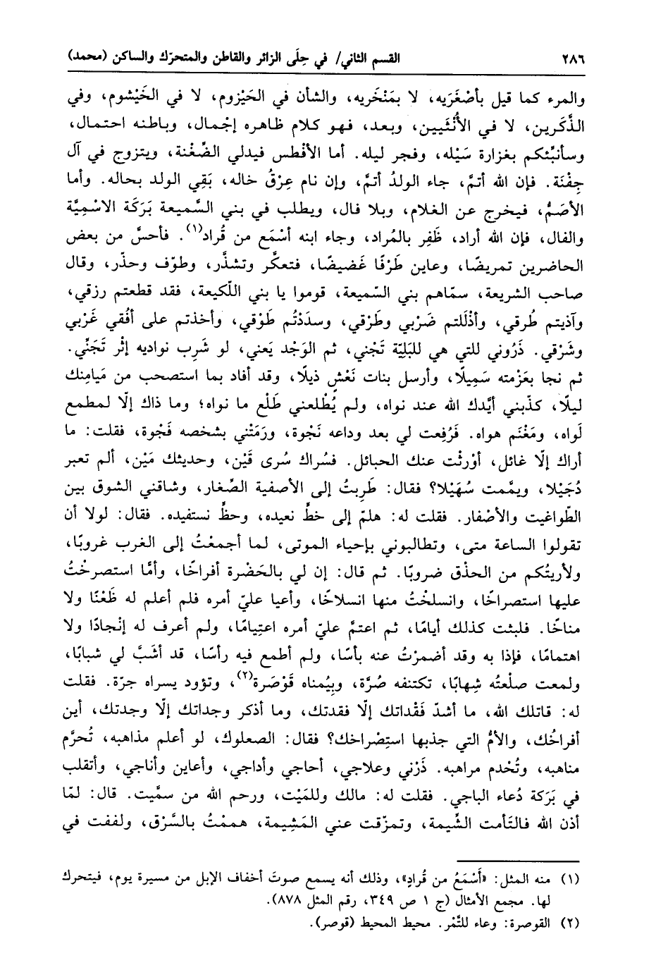 والمرء كما قيل بأصغريه، لا بمنخريه، والشأن في الحيزوم، لا في الخيشوم، وفي الذّكرين، لا في الأنثيين، وبعد، فهو كلام ظاهره إجمال، وباطنه احتمال، وسأنبّئكم بغزارة سيله، وفجر ليله. أما الأفطس فيدلي الضّغنة، ويتزوج في آل جفنة. فإن الله أتمّ، جاء الولد أتمّ، وإن نام عرق خاله، بقي الولد بحاله. وأما الأصمّ، فيخرج عن الغلام، وبلا فال، ويطلب في بني السّميعة بركة الاسميّة والفال، فإن الله أراد، ظفر بالمراد، وجاء ابنه أسمع من قراد «1» . فأحسّ من بعض الحاضرين تمريضا، وعاين طرفا غضيضا، فتعكّر وتشذّر، وطوّف وحذّر، وقال صاحب الشريعة، سمّاهم بني السّميعة، قوموا يا بني اللّكيعة، فقد قطعتم رزقي، وآذيتم طرقي، وأذللتم ضربي وطرقي، وسددتم طوقي، وأخذتم على أفقي غربي وشرقي. ذروني للتي هي للبليّة تجني، ثم الوجد يعني، لو شرب نواديه إثر تجنّي.