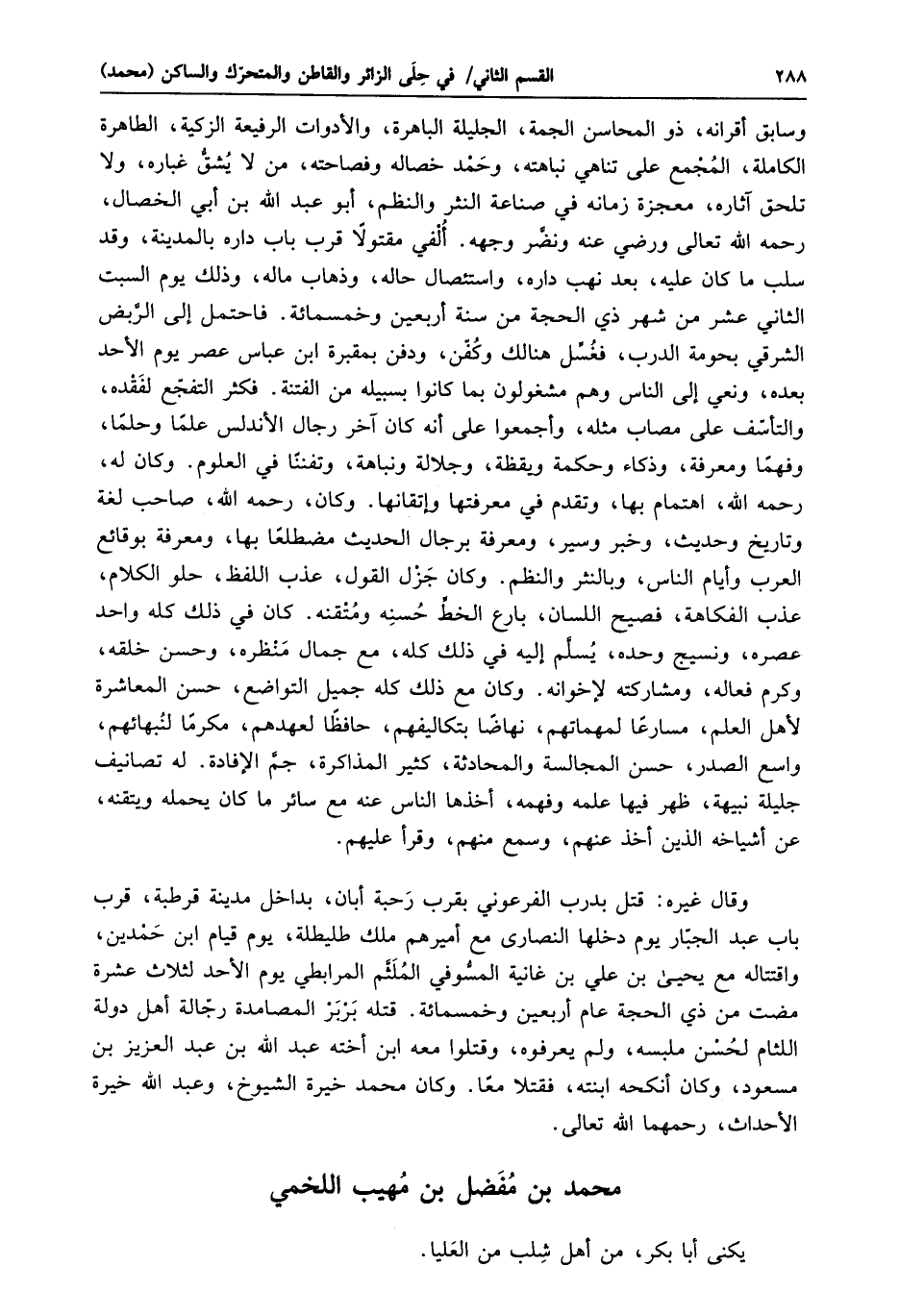 وسابق أقرانه، ذو المحاسن الجمة، الجليلة الباهرة، والأدوات الرفيعة الزكية، الطاهرة الكاملة، المجمع على تناهي نباهته، وحمد خصاله وفصاحته، من لا يشقّ غباره، ولا تلحق آثاره، معجزة زمانه في صناعة النثر والنظم، أبو عبد الله بن أبي الخصال، رحمه الله تعالى ورضي عنه ونضّر وجهه. ألفي مقتولا قرب باب داره بالمدينة، وقد سلب ما كان عليه، بعد نهب داره، واستئصال حاله، وذهاب ماله، وذلك يوم السبت الثاني عشر من شهر ذي الحجة من سنة أربعين وخمسمائة. فاحتمل إلى الرّبض الشرقي بحومة الدرب، فغسّل هنالك وكفّن، ودفن بمقبرة ابن عباس عصر يوم الأحد بعده، ونعي إلى الناس وهم مشغولون بما كانوا بسبيله من الفتنة. فكثر التفجّع لفقده، والتأسّف على مصاب مثله، وأجمعوا على أنه كان آخر رجال الأندلس علما وحلما، وفهما ومعرفة، وذكاء وحكمة ويقظة، وجلالة ونباهة، وتفننا في العلوم. وكان له، رحمه الله، اهتمام بها، وتقدم في معرفتها وإتقانها. وكان، رحمه الله، صاحب لغة وتاريخ وحديث، وخبر وسير، ومعرفة برجال الحديث مضطلعا بها، ومعرفة بوقائع العرب وأيام الناس، وبالنثر والنظم. وكان جزل القول، عذب اللفظ، حلو الكلام، عذب الفكاهة، فصيح اللسان، بارع الخطّ حسنه ومتقنه. كان في ذلك كله واحد عصره، ونسيج وحده، يسلّم إليه في ذلك كله، مع جمال منظره، وحسن خلقه، وكرم فعاله، ومشاركته لإخوانه. وكان مع ذلك كله جميل التواضع، حسن المعاشرة لأهل العلم، مسارعا لمهماتهم، نهاضا بتكاليفهم، حافظا لعهدهم، مكرما لنبهائهم، واسع الصدر، حسن المجالسة والمحادثة، كثير المذاكرة، جمّ الإفادة. له تصانيف جليلة نبيهة، ظهر فيها علمه وفهمه، أخذها الناس عنه مع سائر ما كان يحمله ويتقنه، عن أشياخه الذين أخذ عنهم، وسمع منهم، وقرأ عليهم.